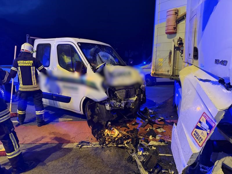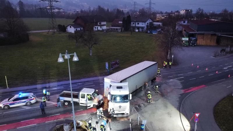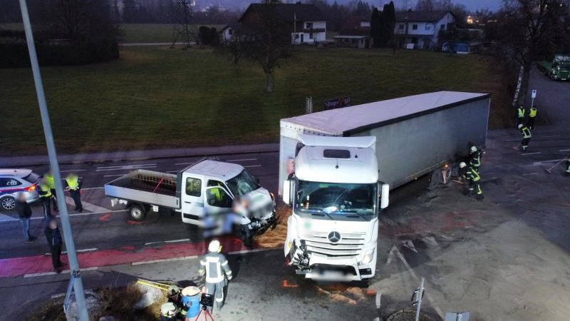 Laut ersten Informationen war ein Sattelschlepper von Lochau Richtung Hörbranz unterwegs und wollte in die Ziegelbachstraße einbiegen. Zeitgleich war ein Pritschenwagen auf der Ziegelbachstraße unterwegs. Bei dem Abbiegevorgang des Sattelschleppers kam es zu einer Kollision zwischen den beiden Fahrzeugen. Der Fahrer des Pritschenwagens wurde dabei unbestimmten Grades verletzt. Nach einer Erstversorgung wurde er ins Krankenhaus gebracht.
