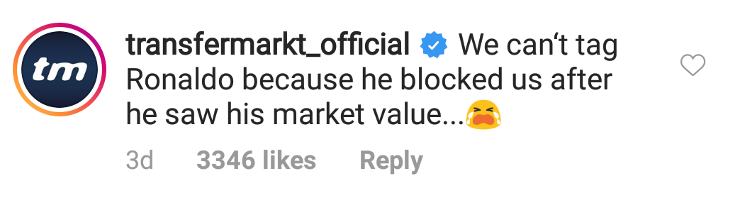 "Wir können Ronaldo nicht verlinken, weil er uns blockiert hat, nachdem er seinen Marktwert gesehen hat...", schreibt die Seite in den Kommentaren.