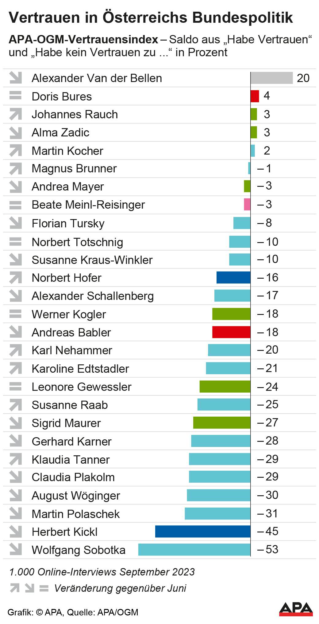 Schlusslicht insgesamt ist Nationalratspräsident Wolfgang Sobotka (ÖVP) mit minus 53. Das wenigste Vertrauen unter den Regierenden hat Bildungsminister Martin Polaschek (ÖVP), der acht Punkte verlor und nun bei minus 31 angelangt ist. Bachmayer sieht diesen Einbruch im Zusammenhang mit der Diskussion um Mängel an den Schulen nach den Ferien. Rauchs Aufstieg interpretiert er wiederum derart, dass dieser Gesundheits- mit Sozialthemen erfolgreich kombiniere und die Streitereien in der Ärzteschaft anderen überlasse. Brunner wiederum profitiere von seinem besonnenen Vorgehen bei den Verhandlungen zum Finanzausgleich.