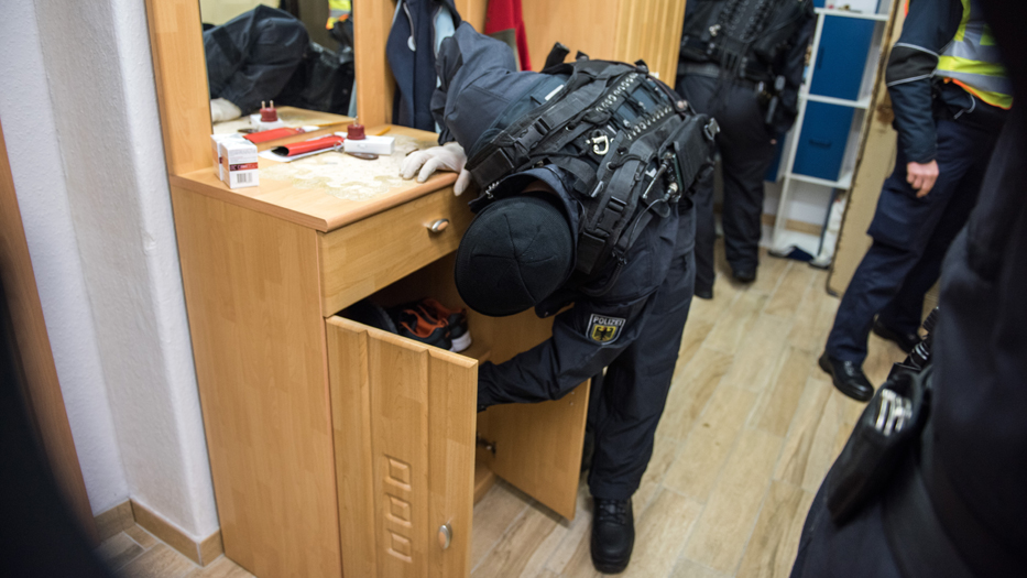Allein im deutschen Bundesland Nordrhein-Westfalen wurden nach Angaben der Polizei 40 Objekte durchsucht. Bei einem Einsatz in Köln seien Spezialeinheiten beteiligt gewesen. In Schleswig-Holstein wurden 35 Objekte durchsucht, mit Schwerpunkt in der Hansestadt Lübeck. Zwei Polizeibeamte seien bei einem Angriff eines Hundes im Kreis Segeberg leicht verletzt worden, sagte ein Sprecher des Innenministeriums in Kiel. Das Tier sei mit einer Schrotflinte erschossen worden.