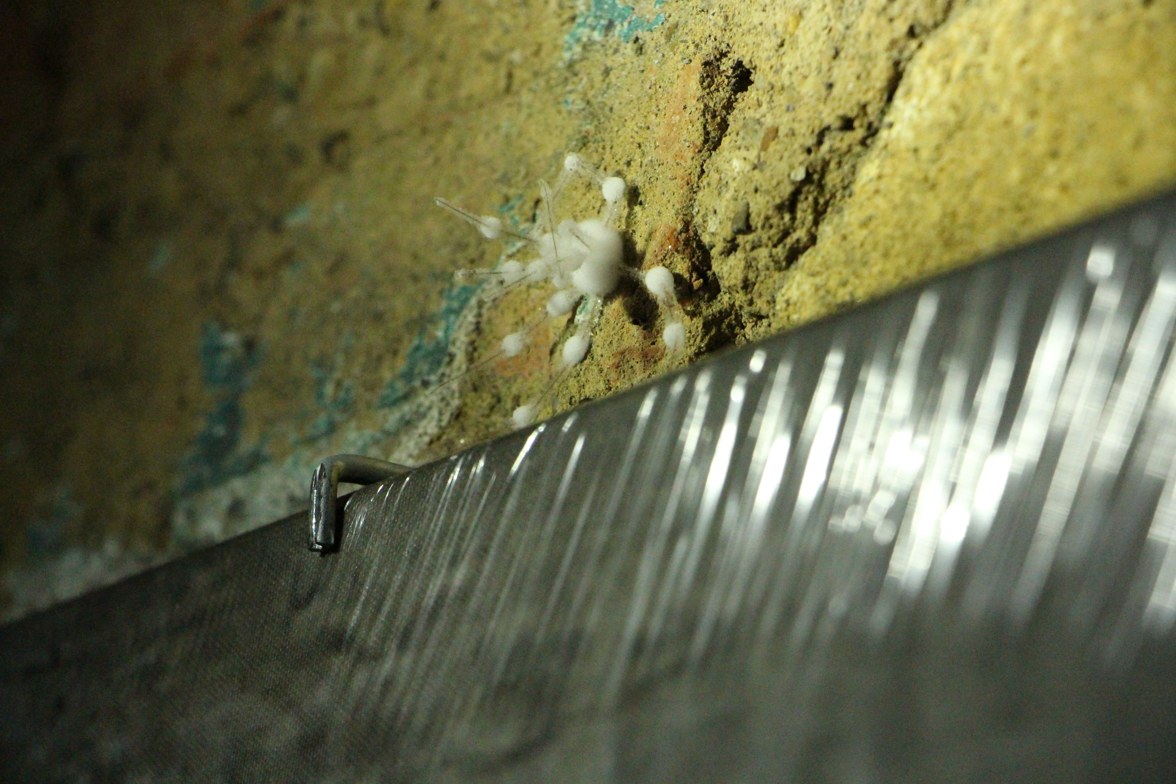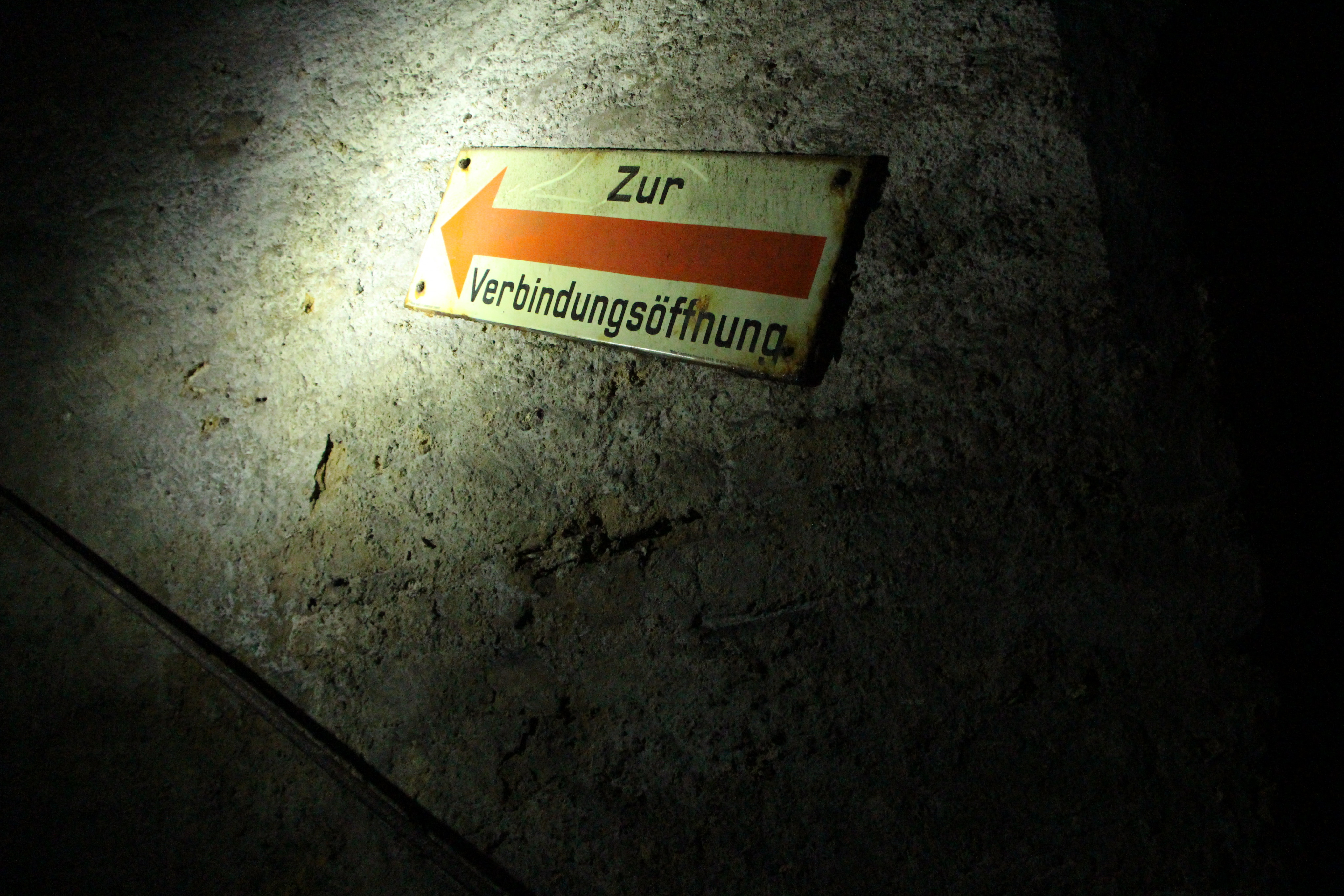 An der linken Wand am Ende der Treppe finden wir ein fluoreszierendes Schild mit der Aufschrift "Zur Verbindungsöffnung". Hier hält die Gruppe für ihre ersten Fotos. Links neben der Treppe ist eine kleine Ausbuchtung, gegenüber davon hängt ein Bild. Arnold hat auf den feuchten Ziegelmauern der Kellergänge verschiedene Bilder anderer Kellertouren aufgehängt. Eine große Spinne über dem Bild ist Opfer von Schimmel oder Salzen geworden. Sie wird nun zu einem beliebten Fotomotiv.