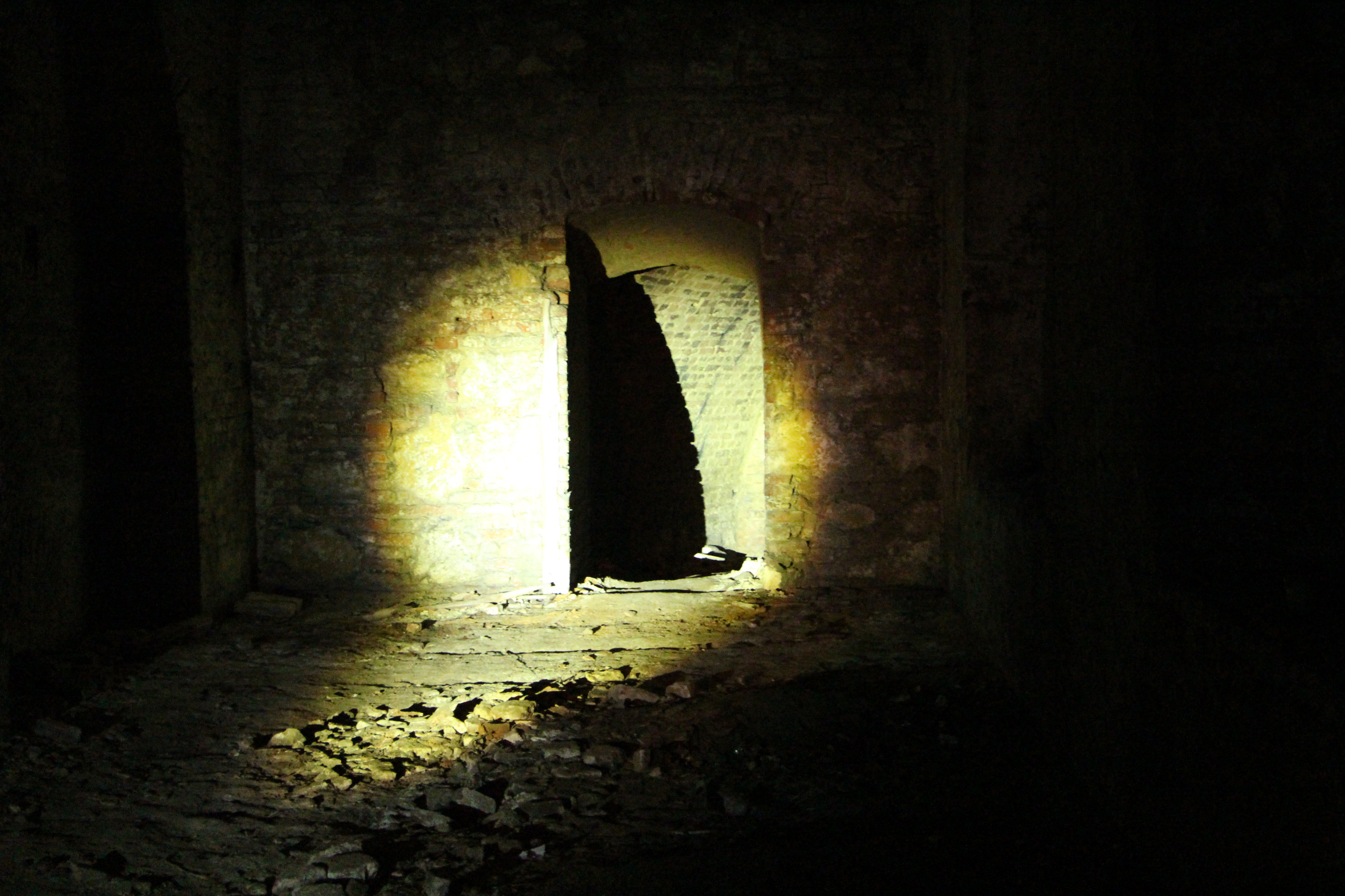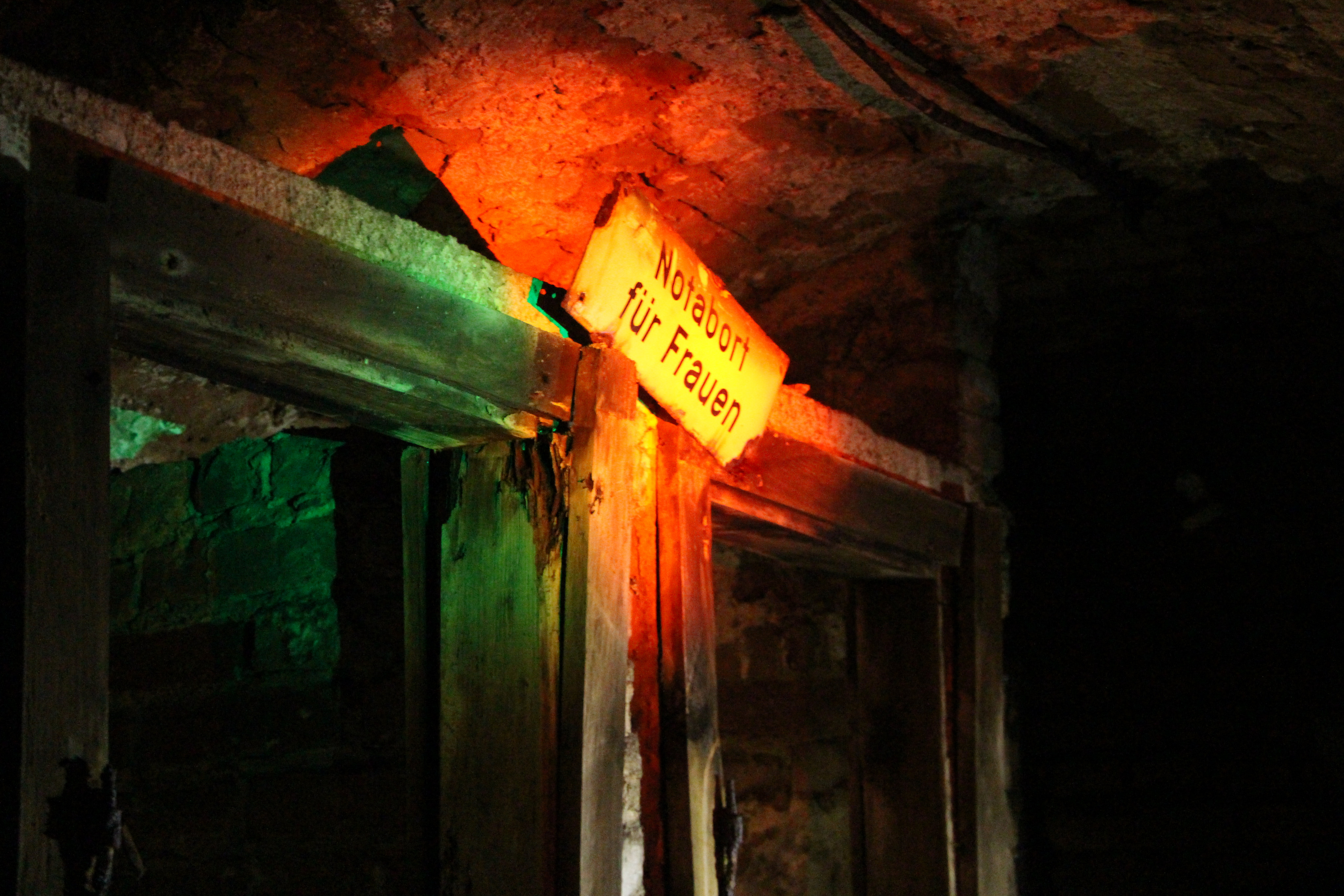 Wir folgen einem Kellergang nach rechts, wo drei teilweise eingefallene, abgetrennte Bereiche sind. Darüber ein Schild "Notabort für Frauen". Lukas Arnold wachelt mit seiner Taschenlampe vor dem fluoreszierendem Schild, um es für unsere Fotos zum Leuchten zu bringen. Dann sollen alle ihre Kameras fokusieren. Ein Piepsen und Klicken: Die ersten Fotos sind gemacht. Bei einer jungen Frau hat das Fotografieren nicht funktioniert, Arnold hilft ihr bei den Kameraeinstellungen. Dann geht es weiter nach Links, tiefer hinein in den Keller.
