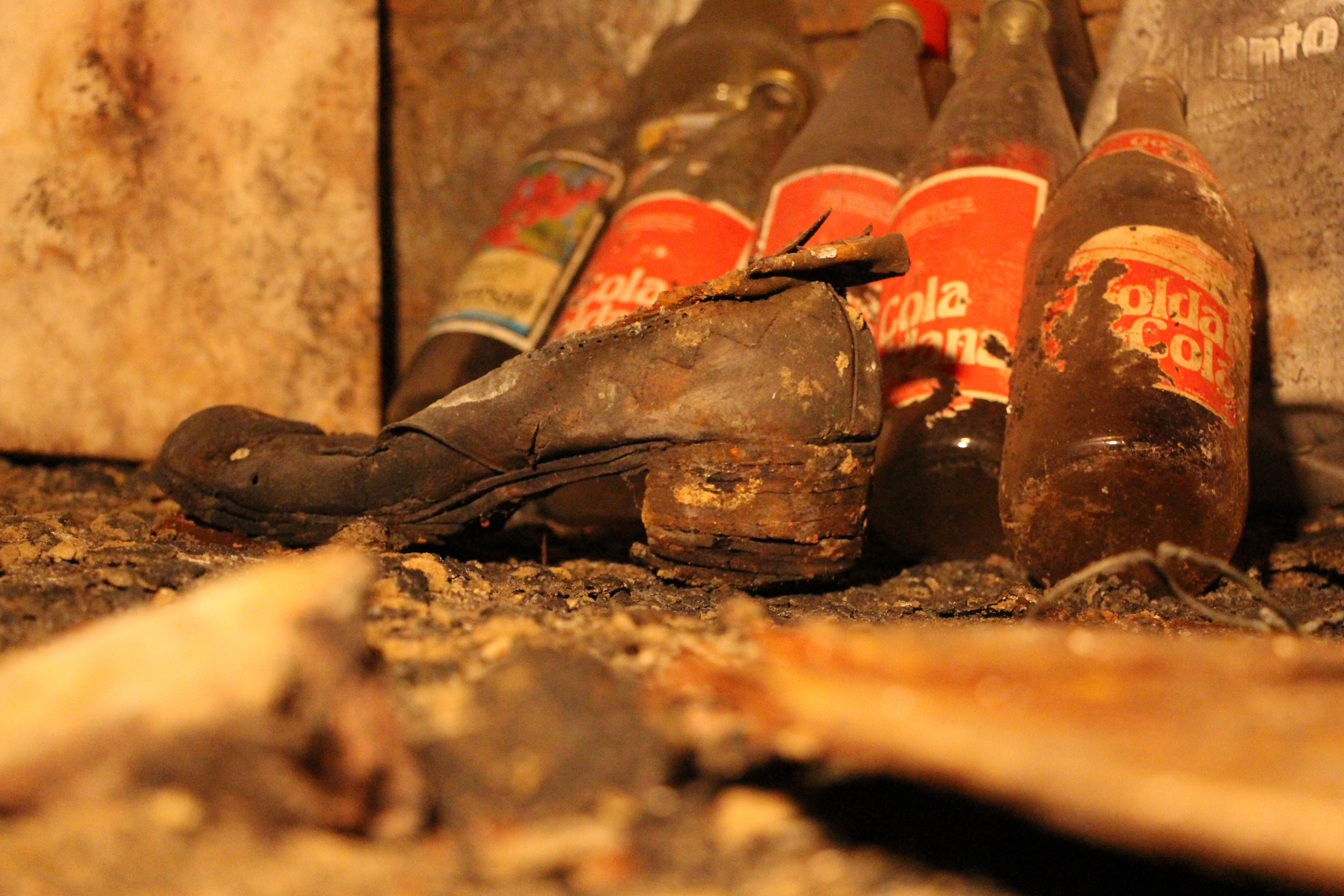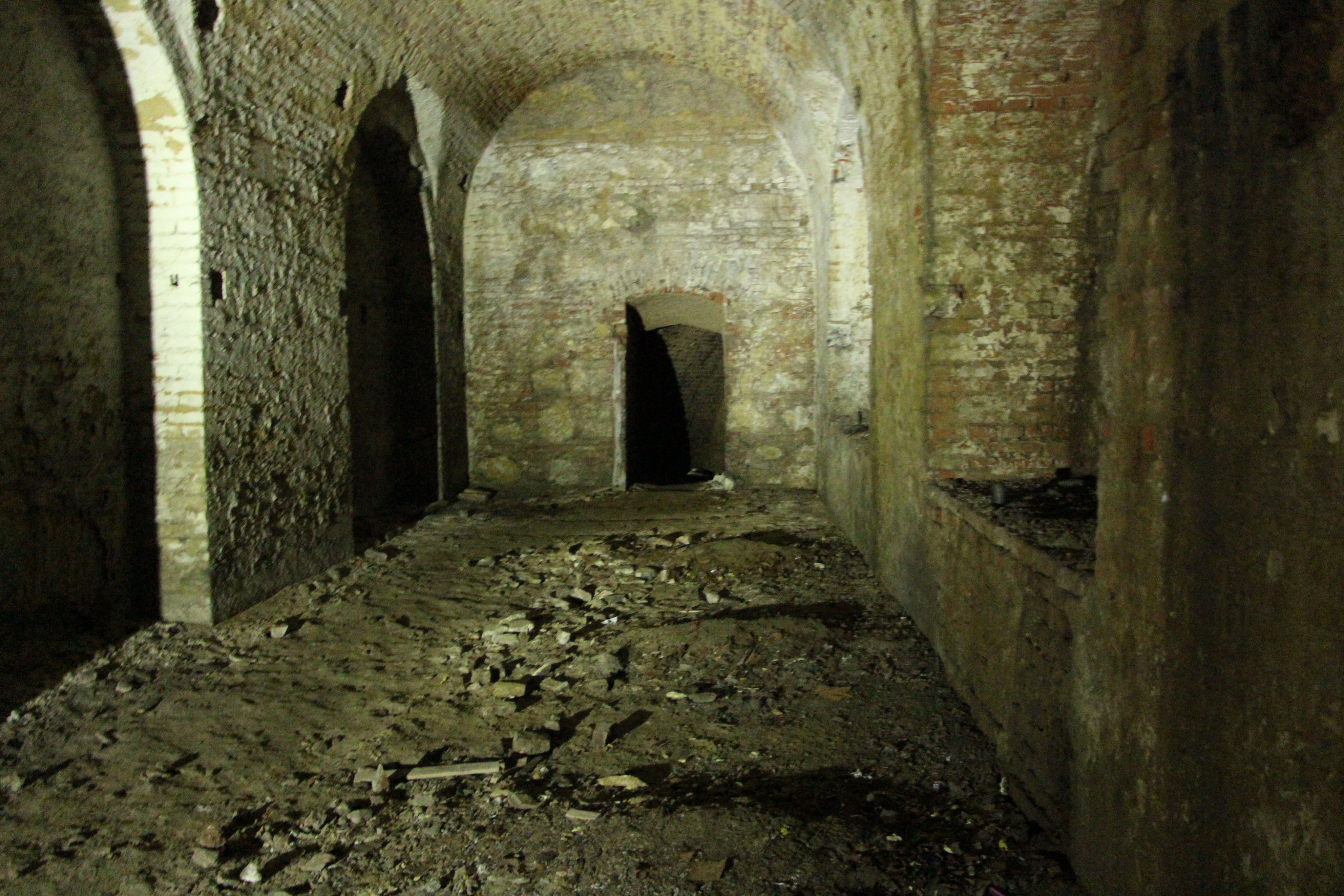 Unser Fotoguide zeigt dann auf eine Öffnung an der Decke des zirka drei Meter hohen Kellergewölbes, dort sei der Schacht, durch den wir im Hof vorher hineingesehen hätten. Dann geht es weiter hinunter in eine Art "drittes Kellergeschoss" über eine kleine Treppe. Dort hätten Arnold und sein Kollege die meisten Gegenstände gefunden. Unser Guide zeigt uns ein teilweise verschüttetes Kellergewölbe. Er hat die Vermutung, dass der Keller sogar noch tiefer gewesen sein könnte. Für uns geht es jedoch nicht mehr weiter an dieser Stelle. Der Boden hier ist sandig und schlammig zugleich. Die Ziegelwände sind feucht und teilweise von einer weißen, salzartigen Schicht bedeckt. Man fühlt sich ein wenig wie ein Höhlenforscher, wenn man Arnold und dem Licht der Taschenlampe durch die Gänge des Kellergewölbes folgt. Viele Keller in Wien, so Arnold, hätten zwei oder drei Stockwerke. Einige davon seien jedoch schon verschüttet.