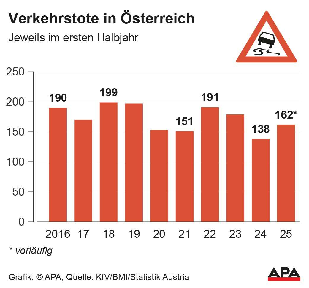 Die Entwicklung der Verkehrsunfälle in Österreich gibt Anlass zur Sorge: Laut aktueller Auswertung des Kuratoriums für Verkehrssicherheit (KFV) sind im ersten Halbjahr 2025 insgesamt 162 Menschen bei Verkehrsunfällen ums Leben gekommen – ein Anstieg um 17 Prozent im Vergleich zum Vorjahr (138 Tote). Besonders tragisch: Vier der Verstorbenen waren Kinder.