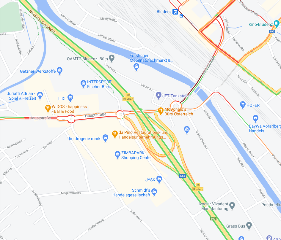 Ein ähnliches Bild zeigt sich auch rund um den Zimba-Park in Bürs. Erschwerend kommt hier noch die Baustellen-Situation bei der Anschlussstelle Bluden/Bürs hinzu.