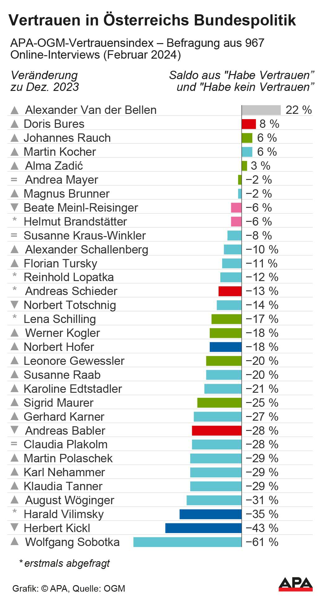Schlechtere Werte als bei der Fragerunde im Dezember weisen nur vier der 32 gelisteten Personen auf: Babler und Totschnig mit einem jeweils um fünf Punkte gesunkenen Saldo sowie die beiden Oppositionsoberhäupter Beate Meinl-Reisinger (NEOS) und Herbert Kickl (FPÖ), die sich je um zwei Punkte verschlechterten. Schlusslicht mit einem Saldo von minus 61 ist weiterhin Nationalratspräsident Wolfgang Sobotka (ÖVP), obwohl sein Wert sich um fünf Punkte verbessert hat.