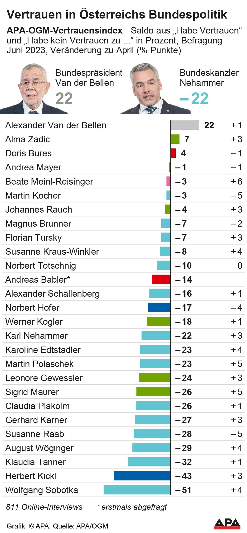 Davon profitierten vor allem NEOS-Chefin Beate Meinl-Reisinger (-3 nach -9 im April), Grünen-Klubobfrau Sigrid Maurer (-26 nach -31), ÖVP-Bildungsminister Martin Polaschek (-23 nach -28), ÖVP-Klubchef August Wöginger (-29 nach -33), ÖVP-Nationalratspräsident Wolfgang Sobotka (-51 nach -55, weiterhin Schlusslicht im Ranking), ÖVP-Kanzler Karl Nehammer (-22 nach -25), ÖVP-Innenminister Gerhard Karner (-27 nach -30), Grünen-Gesundheitsminister Johannes Rauch (-4 nach -7), Grünen-Umweltministerin Leonore Gewessler (-24 nach -27) und FPÖ-Chef Herbert Kickl (-43 nach -46) - auch wenn diese alle weiter im Vertrauensminus liegen.