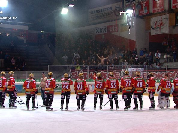 Die VEU Feldkirch feiert ihren 4:1 Derbysieg über den EHC Lustenau