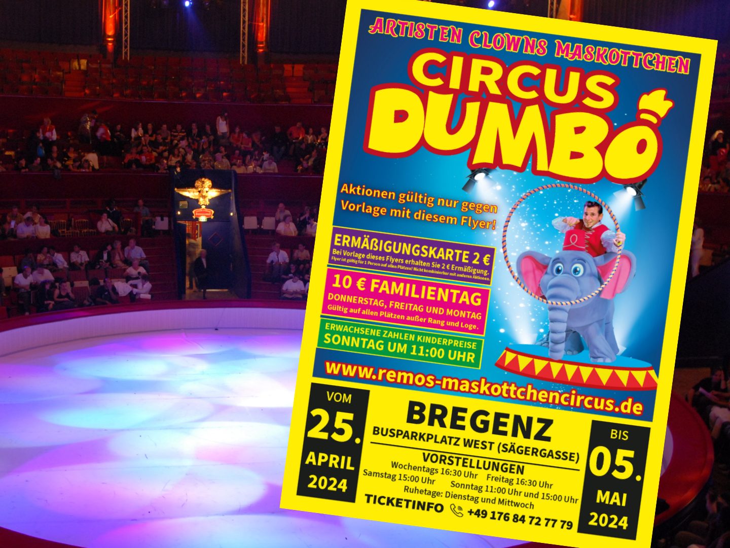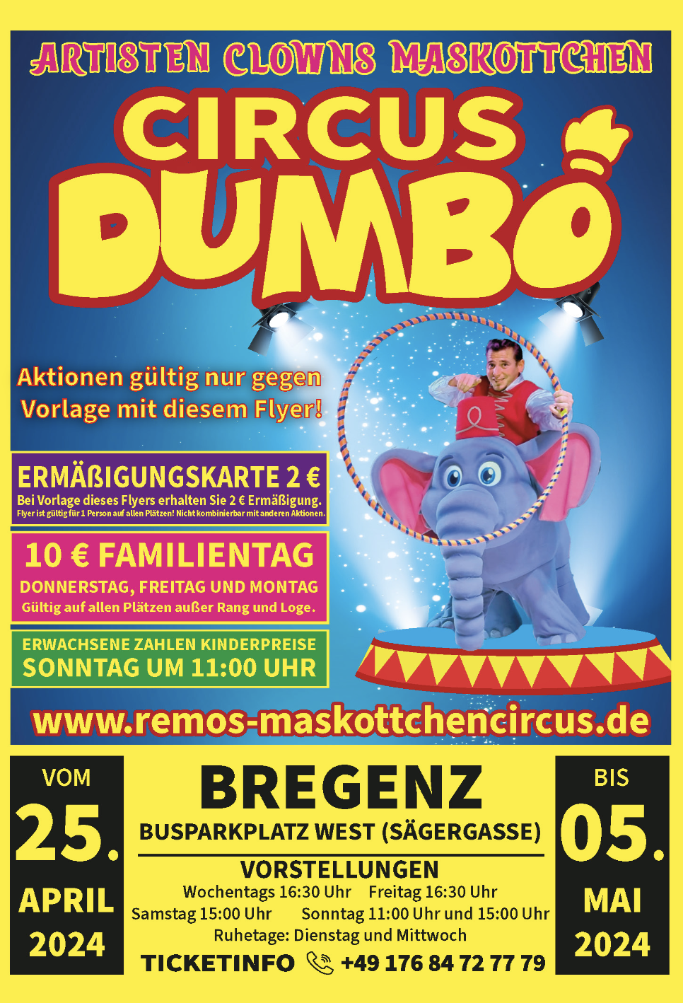 Remo's Maskotchen-Circus ist derzeit auf Tournee und gastiert in vielen Städten Deutschlands. Vom 25. April bis zum 05. Mai können sich auch die Vorarlberger freuen: Der Zirkus gastiert in Bregenz. Unter der Zirkuskuppel fliegt Dumbo, der fliegende Baby-Elefant, hoch über den Köpfen der Zuschauer und sorgt für faszinierende Momente für Klein und Groß.