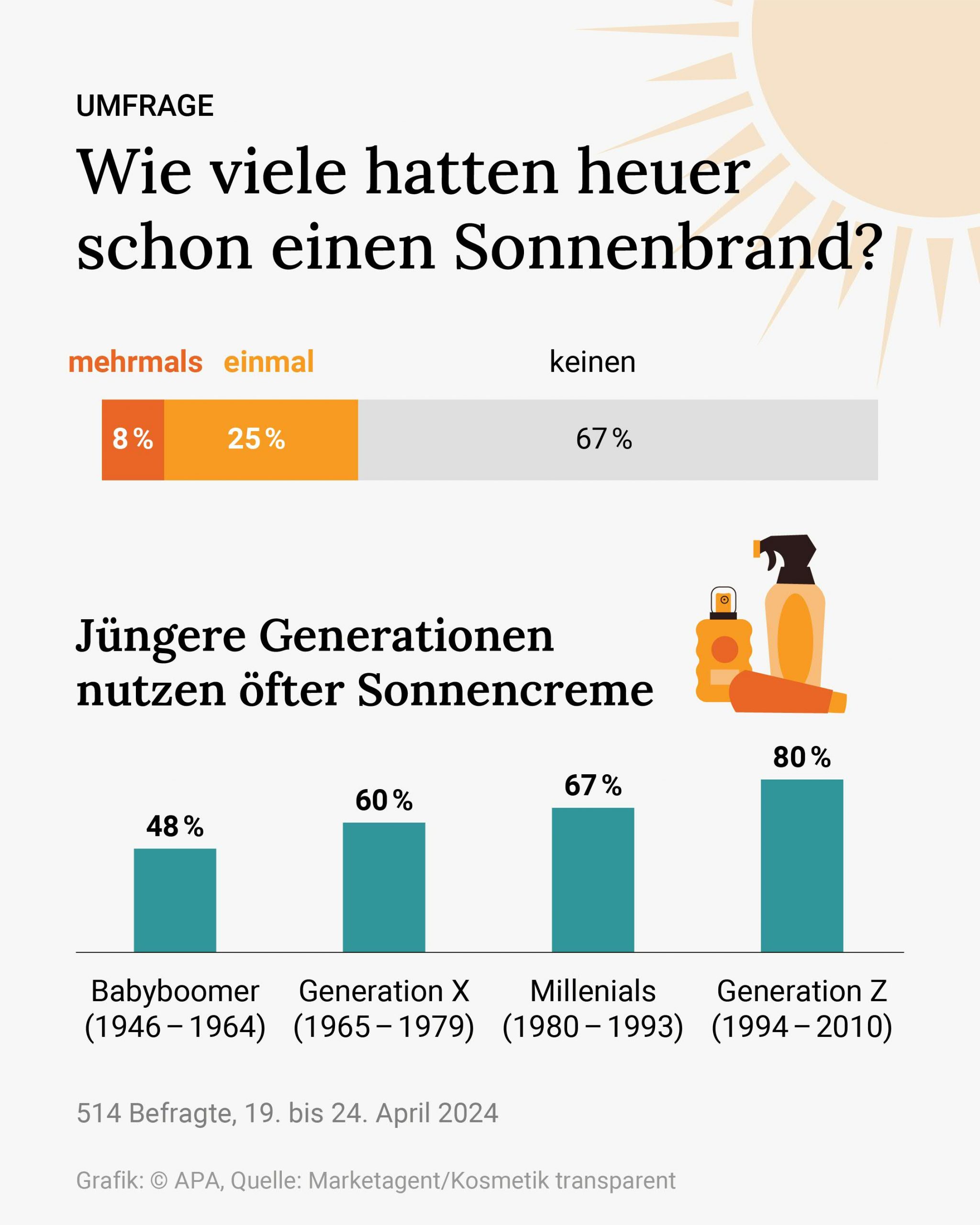 Dabei ist gebräunte Haut nach wie vor begehrt: Für 52,9 Prozent ist Sonnenbräune im Sommer wichtig. Besonderen Wert darauf legen Frauen mit 58,9 Prozent und die "Generation Z" mit 66,9 Prozent. Die Mehrheit (82,1 Prozent) weiß aber mittlerweile, dass man auch bei Verwendung von Sonnenschutz braun wird.