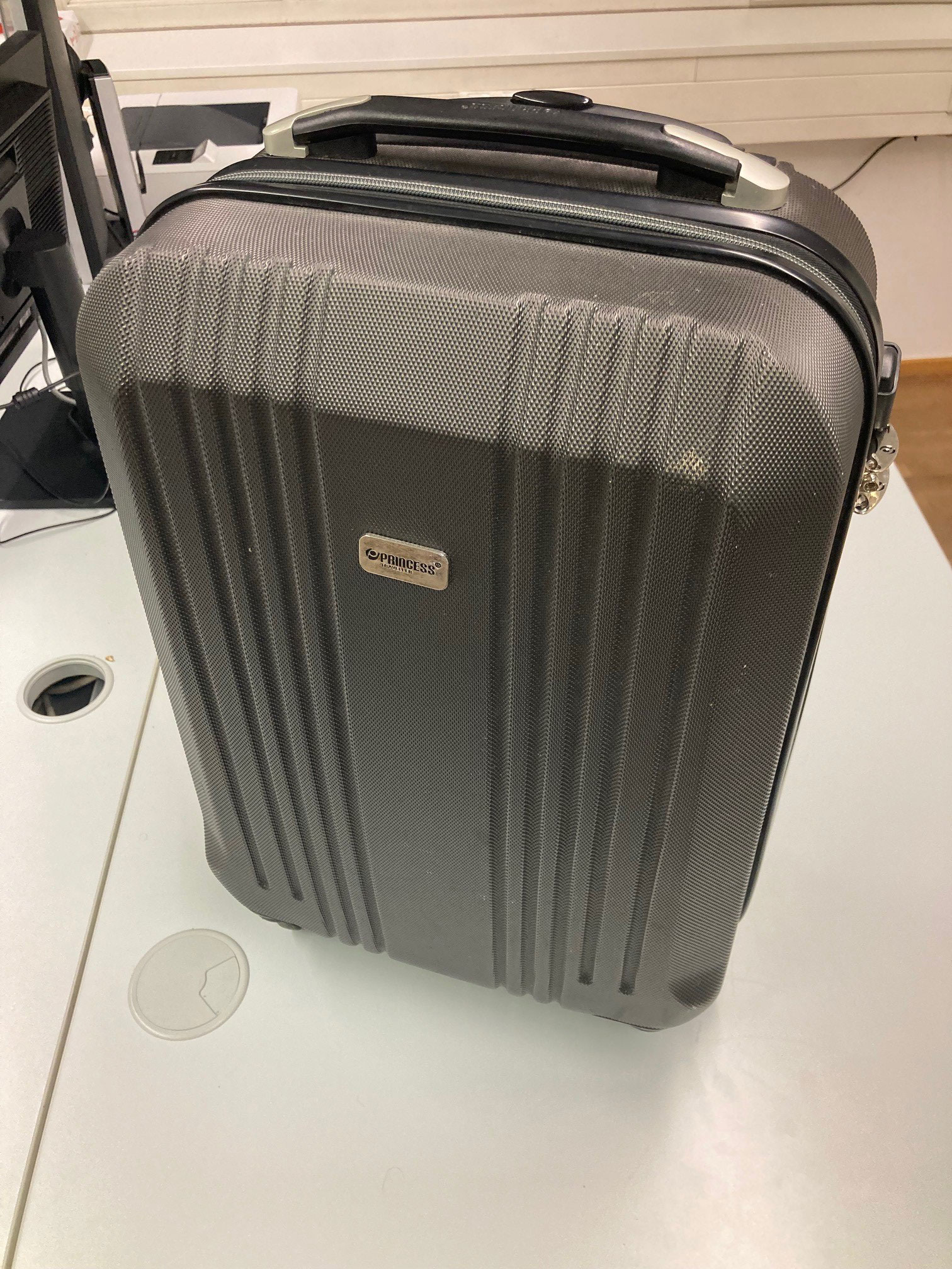 • Kleiner, grauer Reisekoffer mit div. Kleidung als Inhalt