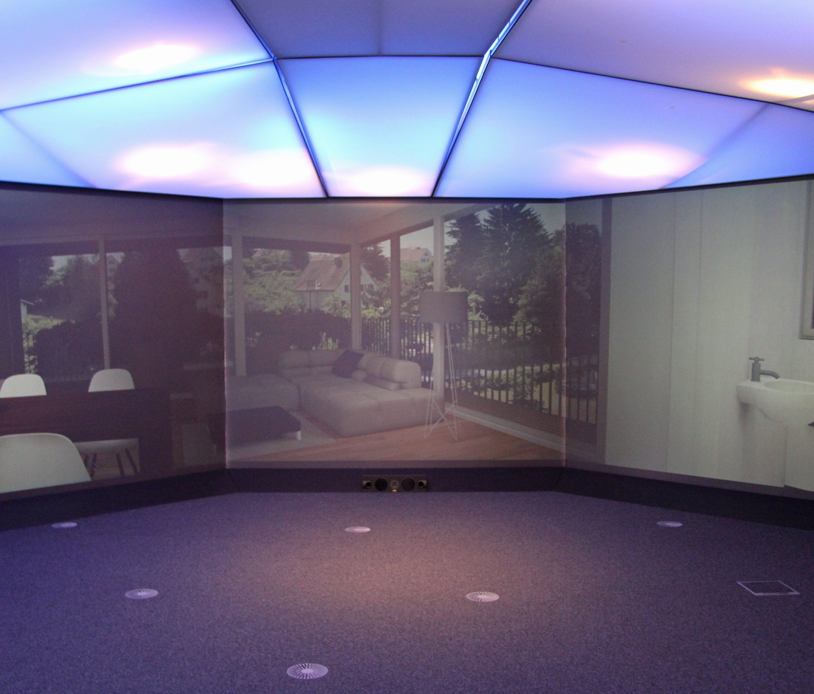 Die Leinwand zeigt eine kompett eingerichtete Wohnung, wahlweise zwei- oder dreidimensional. In Echtzeit passen sich die Lichtverhältnisse an, sobald man eine Lampe in der Wohnung verschiebt oder die Art der Beleuchtung wechselt. Während man durch die Wohnung geht, kann man die Sonneneinstrahlung zu den verschiedenen Tag- und Jahreszeiten bis ins Detail simulieren. Woran früher Simulationen stunden- und tagelang rechneten, um ein realistisches Bild zu erzeugen, arbeitet HILITE nur wenige Sekunden.