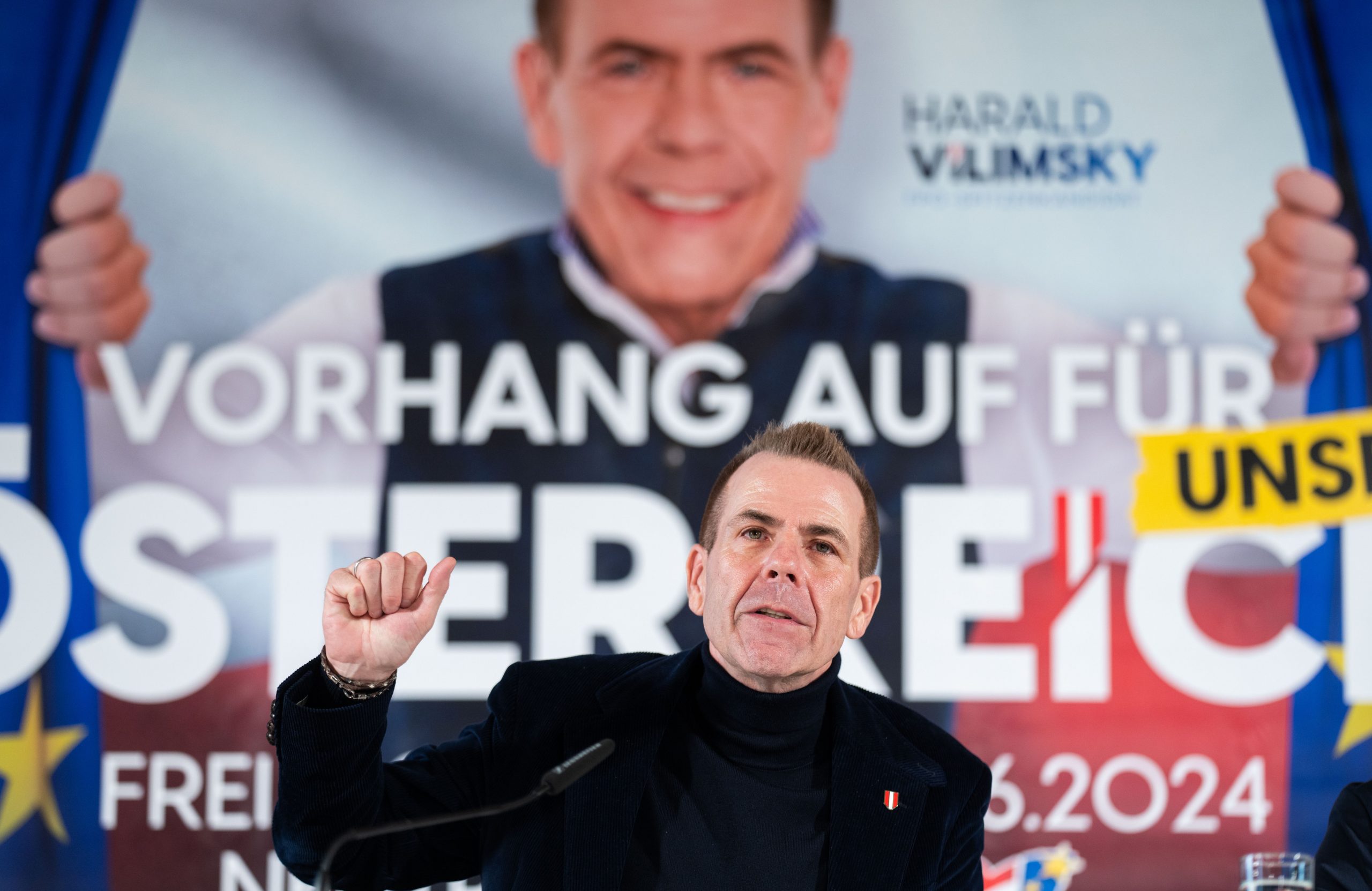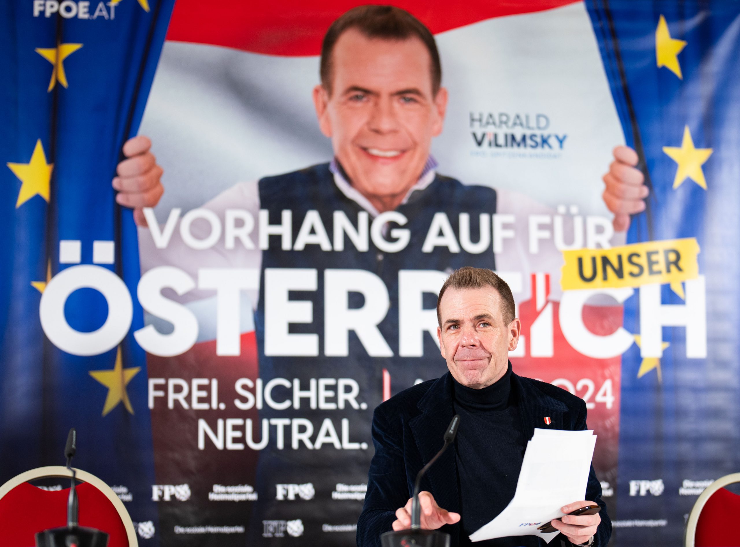 "Frei. Sicher. Neutral." lautet dann auch die Subbotschaft der zweiten Plakatwelle. Vilismky taucht dabei hinter einem Vorhang, der die EU-Flagge abbildet vor rot-weiß-rotem Hintergrund auf. "An uns ist der Vorwurf gerichtet worden, dass für den Einstieg in die Kampagne ein Plakat gewählt wurde, dass eine negative Konnotation hätte", berief er sich auf das stilisierte Sujet mit von der Leyen und Selenskyj, das aussieht, als würden sie sich küssen.