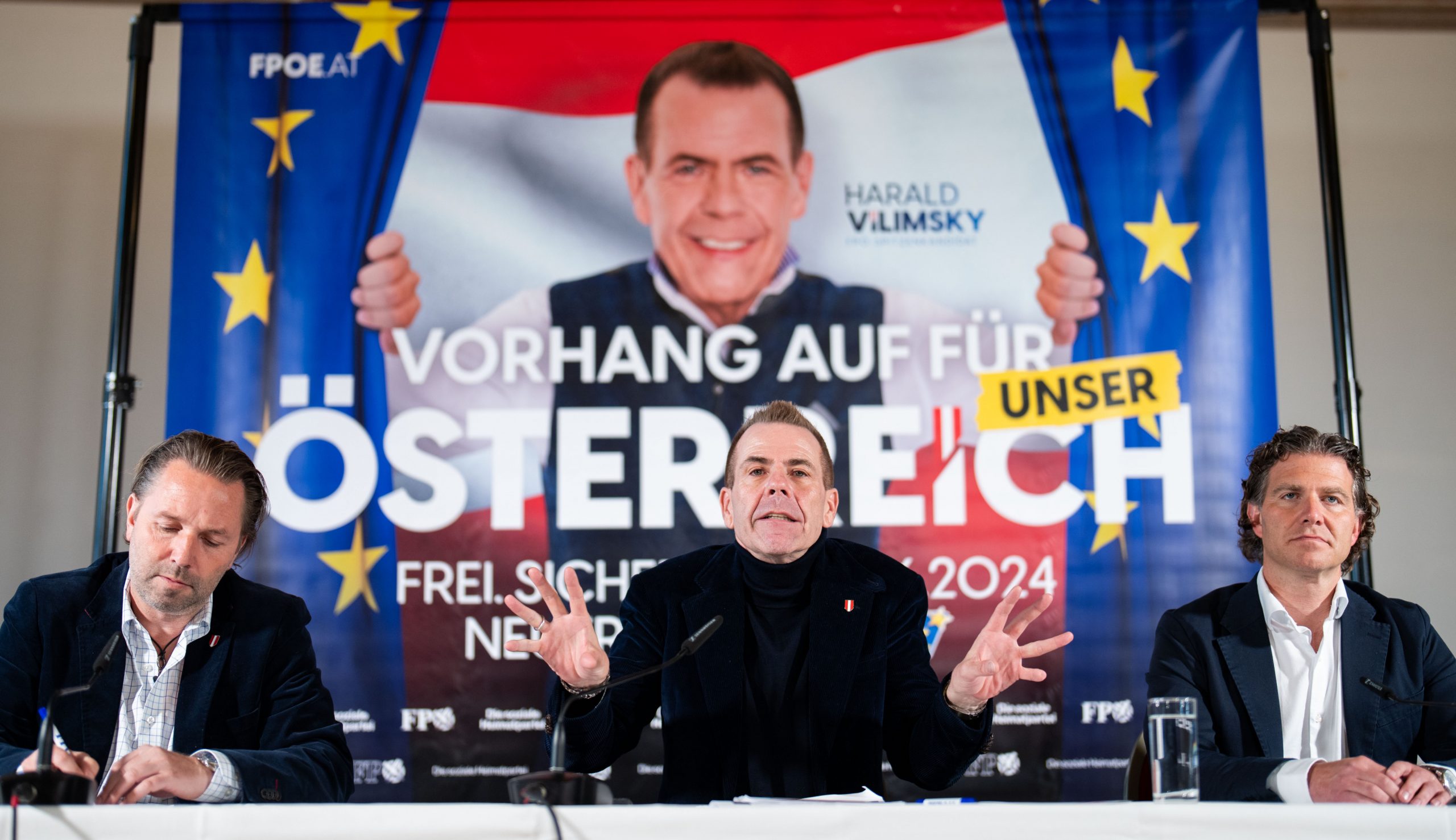 Nach den Aufregerplakaten zum "EU-Wahnsinn", die EU-Kommissionspräsidentin Ursula von der Leyen mit dem ukrainischen Präsidenten Wolodymyr Selenskyj zeigen, schwenkt die FPÖ nun doch noch auf einen Positivwahlkampf um. "Vorhang auf für unser Österreich" lautet der Slogan der zweiten Welle, die am Mittwoch im niederösterreichischen Stift Göttweig vorgestellt wurde. Erstmals zu sehen ist darauf nun auch Spitzenkandidat Harald Vilimsky.