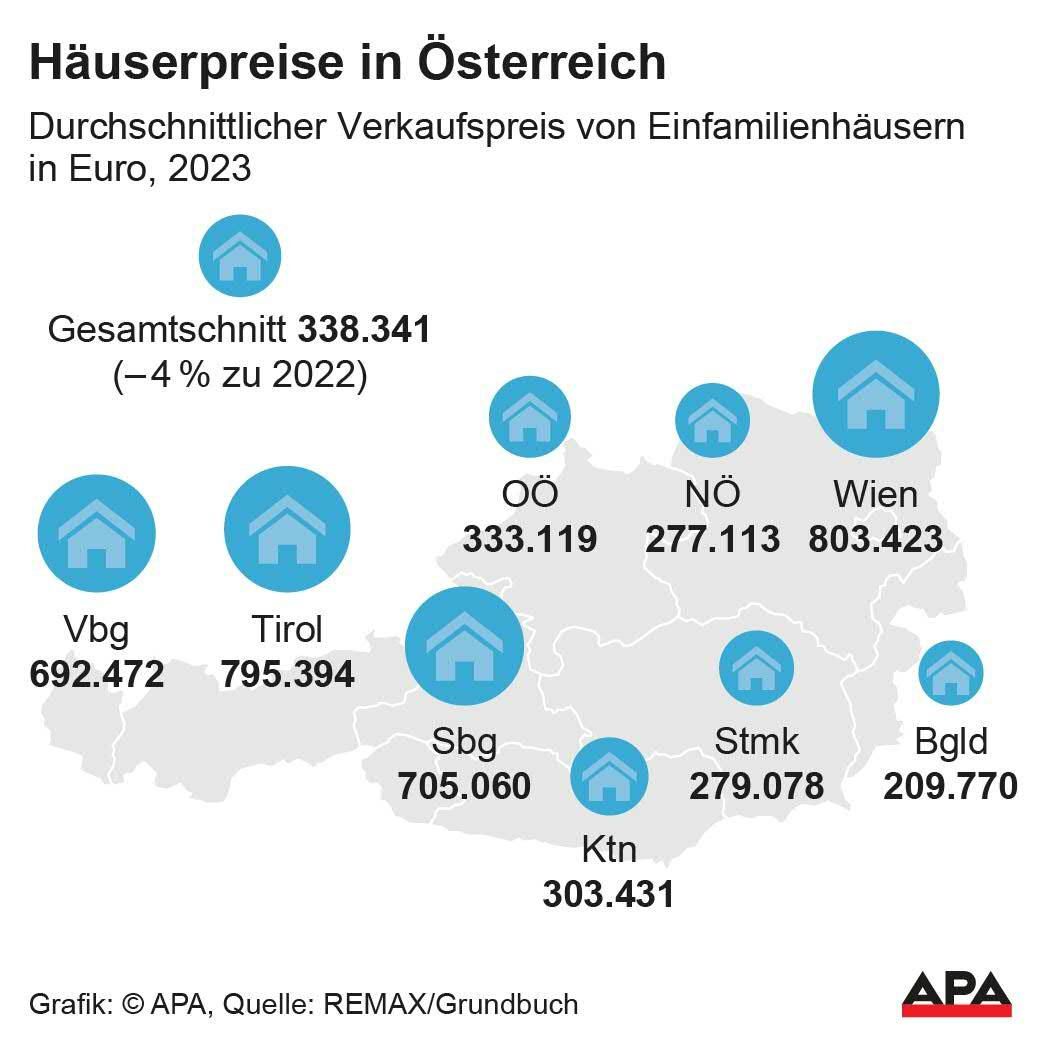 Die billigsten Häuser gab es mit im Schnitt 209.770 Euro im Burgenland und 277.113 Euro in Niederösterreich, die teuersten mit 795.394 Euro in Tirol und 803.423 Euro in Wien. Da in allen Bundesländern die Menge an Transaktionen fiel und die Preise im Schnitt auch rückläufig waren, wurden für Einfamilienhäuser in Summe 2023 nur mehr 3,28 Mrd. Euro ausgegeben, nach rund 4,1 Mrd. Euro in den Jahren 2021 und 2022.
