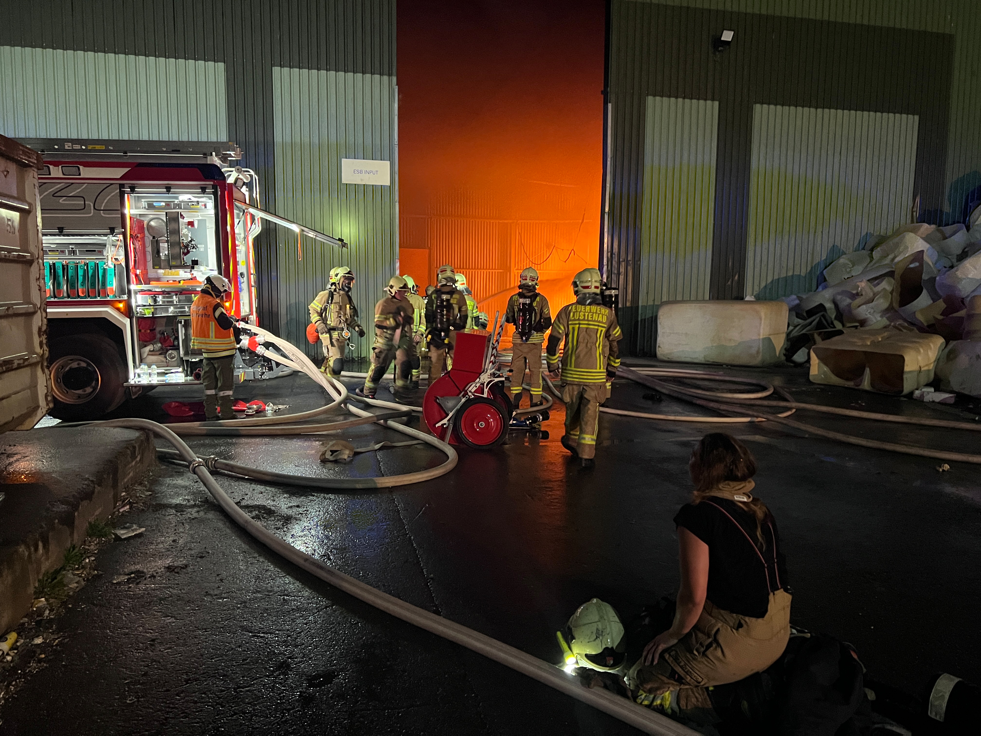 "Der Löschtankbehälter wäre irgendwann leer geworden. Und wir hätten nicht so viel Wasser reinbekommen, wie wir benötigt hätten", so Schmid. Um aber durchgehend mit voller Kraft gegen das Feuer kämpfen zu können, wurden vorausschauend zusätzliche Tankfahrzeuge angefordert und auch Pumpen an den umliegenden Gewässern installiert. Dieses Vorgehen war laut dem Einsatzleiter besonders wichtig, da die Halle beim Eintreffen bereits im Vollbrand stand und drohte auf einer weitere Halle, in welcher Tonnen von Papier gelagert wird, überzugreifen.