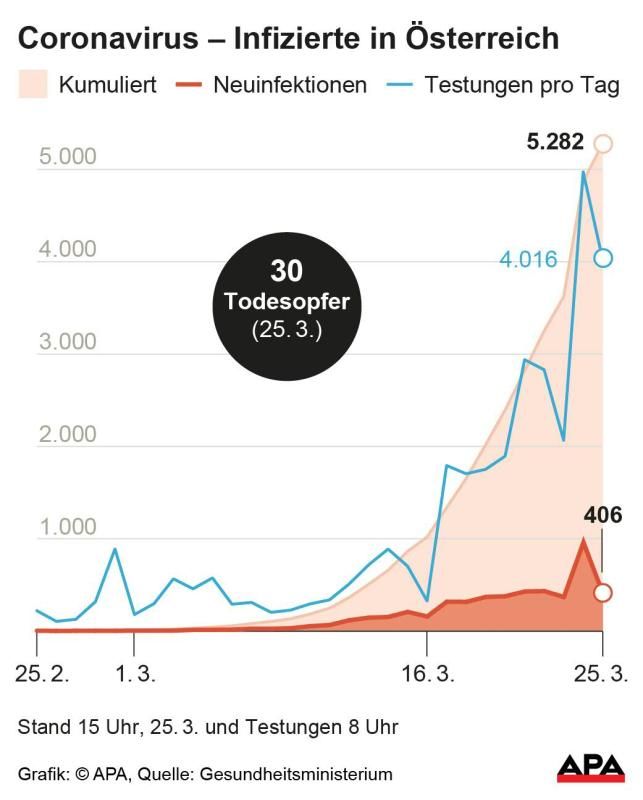 Damit ist die Zunahme mit 17,74 Prozent wieder leicht abgeflacht. Zuvor stieg der Wert um rund 24 Prozent. Allerdings wird von den Behörden ein Wachstum der Kurve im einstelligen Bereich angestrebt. Mittlerweile sind 30 Österreicher offiziell dem SARS-CoV-2-Erreger erlegen.