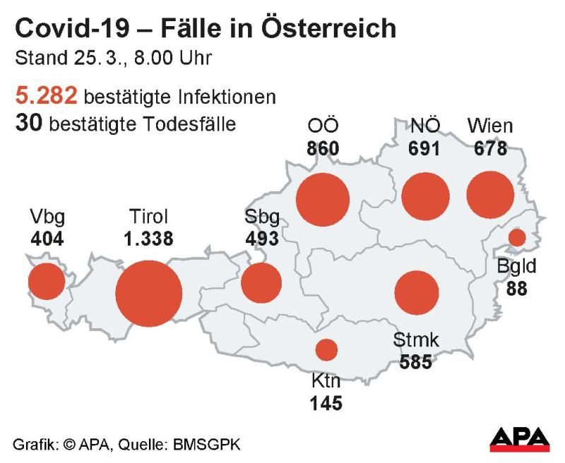 Die meisten Toten sind in Wien zu beklagen, dort starben zwölf Menschen am Coronavirus. In der Steiermark sind es offiziell fünf Patienten, die Covid-19 nicht überlebt haben, in Tirol und in Niederösterreich je vier, in Oberösterreich und dem Burgenland je zwei und in Kärntner einer. Im Landesklinikum Lilienfeld starben erst in der Nacht auf Mittwoch zwei positiv auf das Coronavirus getestete Patienten. Die Betroffenen, ein 87-Jähriger sowie eine 83-Jährige, wiesen bereits Vorerkrankungen auf.