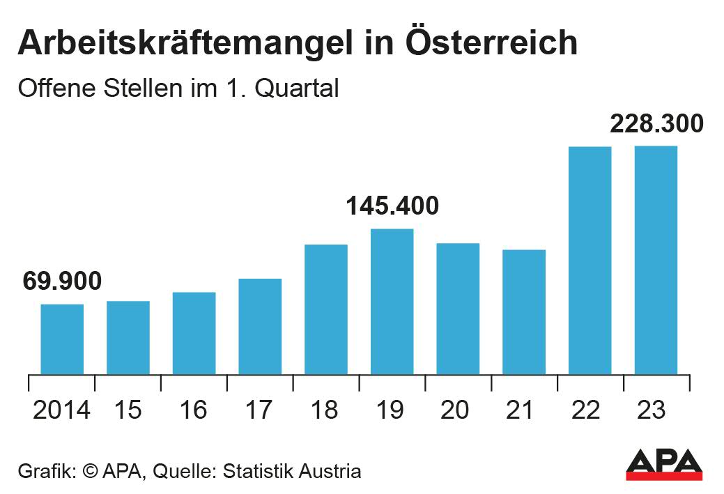228.300 Stellen waren laut den Betrieben in Österreich im 1. Quartal 2023 offen. Vor einem Jahr waren 227.700 Jobs, also praktisch gleich viele, unbesetzt.