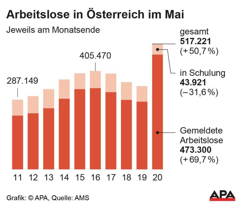 Die Coronakrise führt weiter zu extrem hohen Arbeitslosenzahlen in Österreich. Ende Mai waren mehr als 517.000 Personen arbeitslos oder in Schulung, das sind um 174.000 mehr als im Vorjahresmonat. Die Arbeitslosenquote belief sich auf 11,5 Prozent.