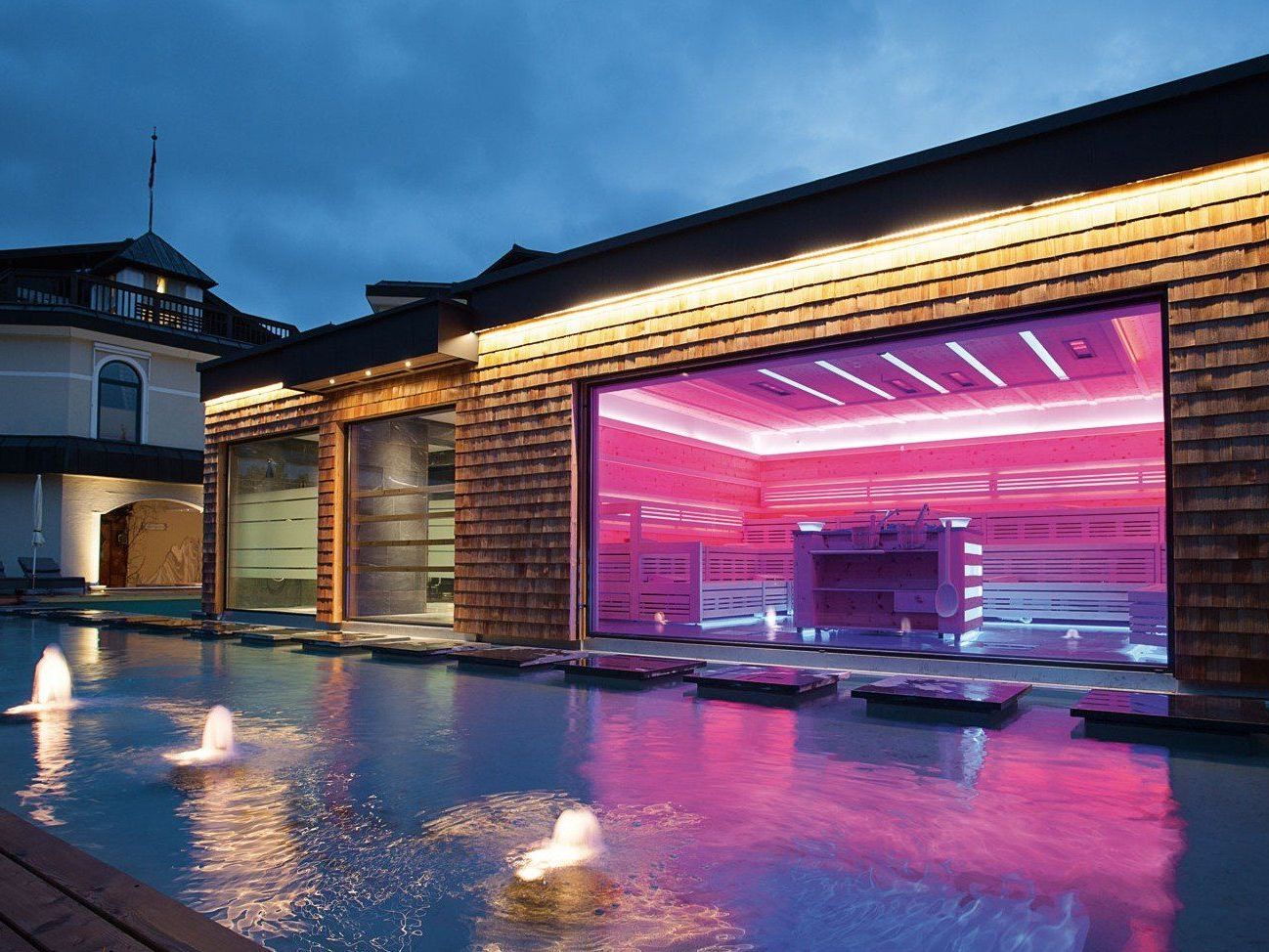 Eine Attraktion dort ist die nagelneue Hochkönig-Sauna, die mit der guten alten Schwitzstube im Hüttenstil nur mehr wenig gemeinsam hat. Die Architektur ist modern und geradlinig, große Fester geben Ausblick auf die grandiose Bergkulisse, verhindern aber Einblicke. Die wahre Überraschung wartet dann im Inneren: das „multisensorische Schwitzen”. Ein Trend der Zukunft, den man in der Übergossenen Alm bereits heute erleben kann. Zwar sind die Liege- und Sitzbereiche in bekannter Form gestaltet, hat man allerdings Platz genommen, tut sich Erstaunliches. Ist beispielsweise der Sagen-Aufguss an der Reihe, erscheint ein Video zur Geschichte der Übergossenen Alm, werden die Schwitzenden von Nebelschwaden eingehüllt, erleben Blitz und Donner und sonst so allerhand, was zu einer mystischen Geschichte dazu gehört. Je nach Aufguss-Thema wechseln die Inszenierungen und Effekte.