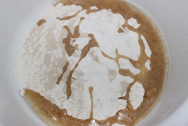 Zuerst Mehl, Trockengerm, Öl und Salz langsam mit einem Knethaken vermischen, danach das Wasser nach und nach zugeben.
