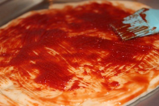 Den Teig auf einem leicht beölten Backblech ausbreiten. Danach geht es auch schon ans Belegen.