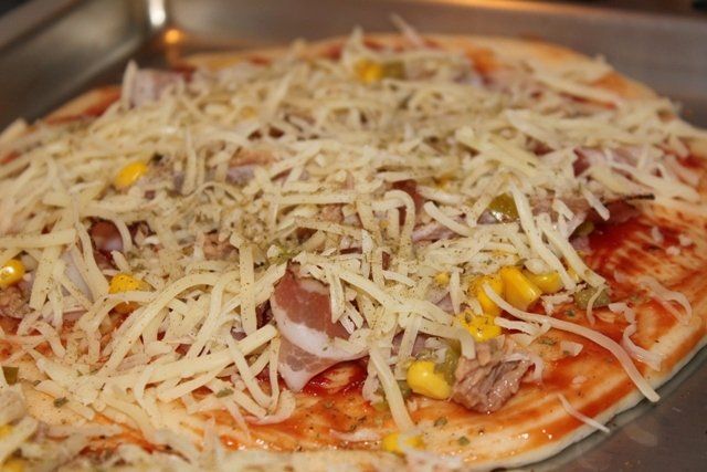 Wir haben uns für Salami, Thunfisch, Speck, Mais, Pfefferoni und Emmentaler entschieden. Davor haben wir den Teig noch mit Tomatenmark bestrichen.
