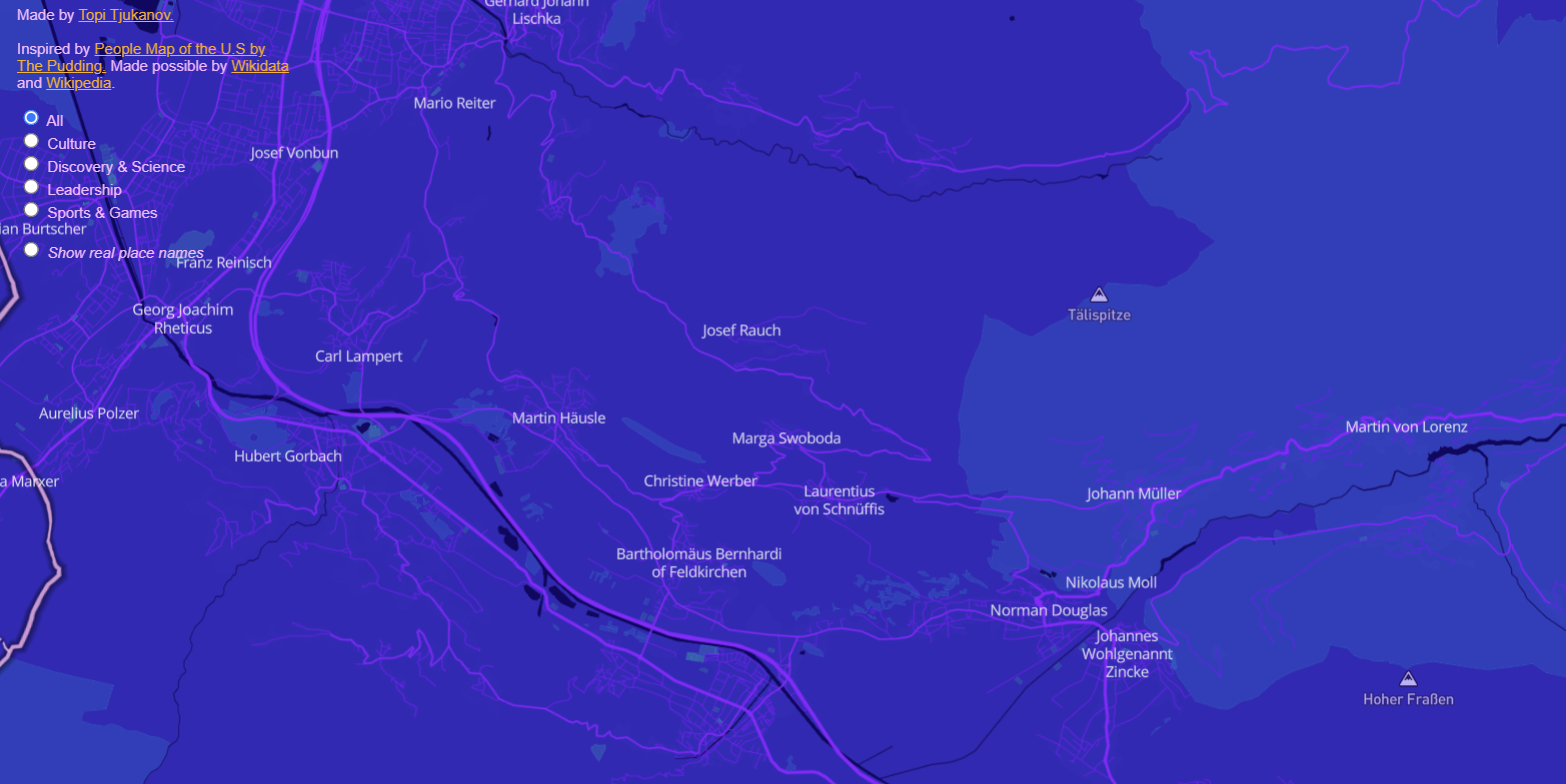Die Karte ist einfach zu bedienen: Durch Zoomen und Verschieben können Nutzer die bekanntesten Personen in der gewünschten Region aufspüren. Je weiter man in die Karte hineinzoomt, desto mehr Namen tauchen auf. Um die Übersicht zu behalten, gibt es eine Filterfunktion, mit der man Personen nach Kategorien wie Kultur, Wissenschaft oder Sport sortieren kann.
