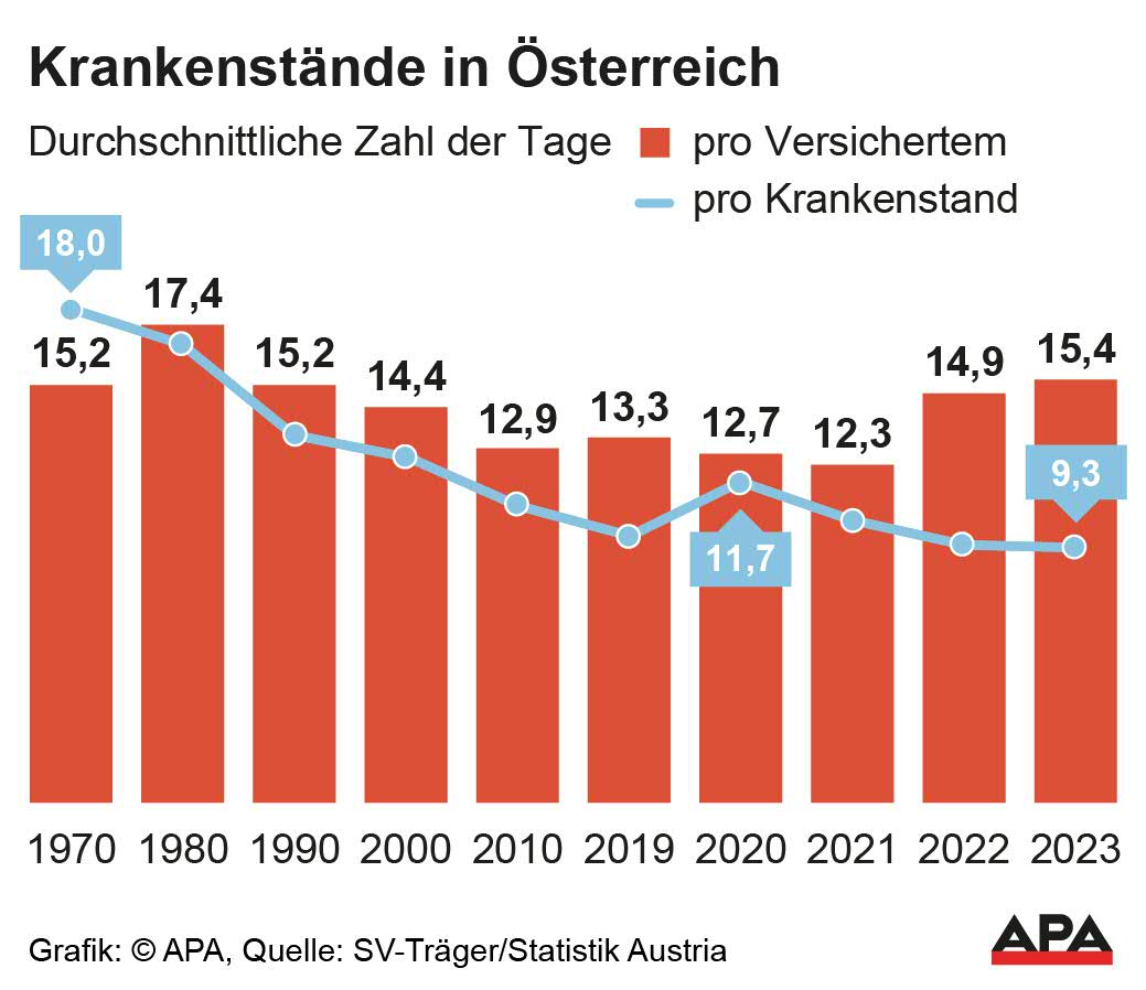 Entwicklung der Krankenstände in Österreich seit 1970. Durchschnittliche Zahl der Tage pro Versichertem und pro Krankenstand.