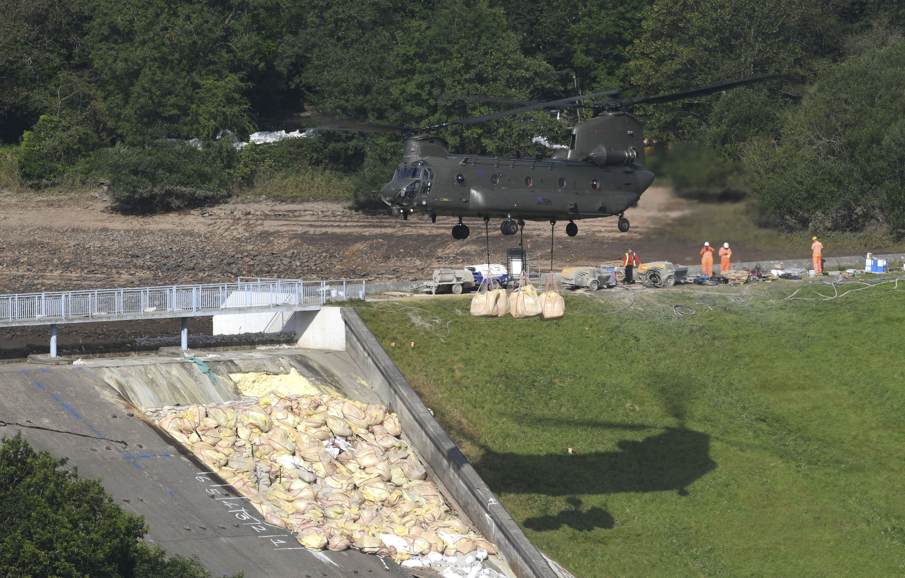 Mit Hubschraubern werden Sandsäcke zur Stabilisierung auf den beschädigten Damm in Whaley geflogen. (Bild: AP)