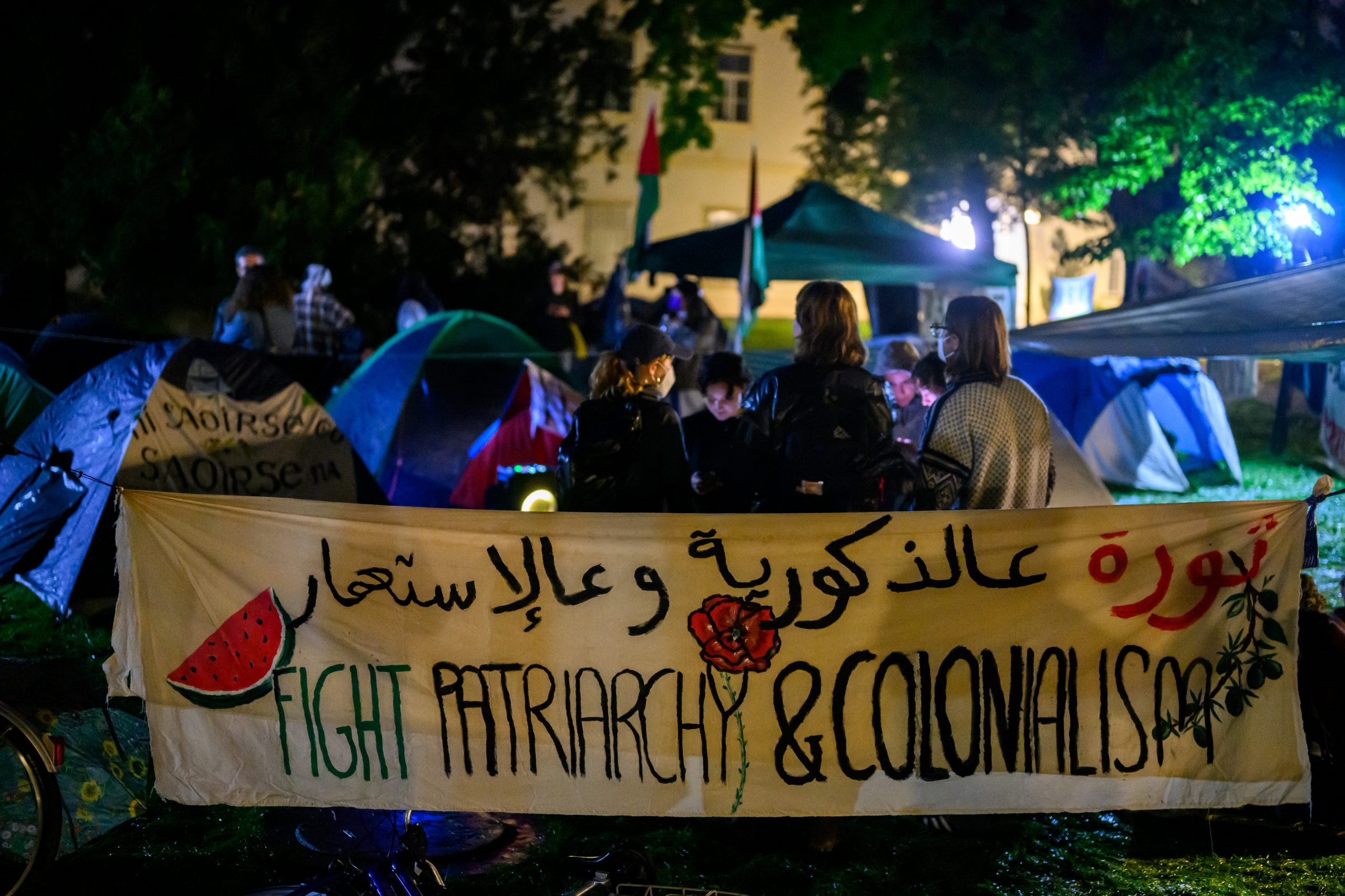 Auf einer Wiese am Campus sind rund zehn Zelte aufgestellt, die zu einem guten Teil von Transparenten umzäunt sind. Campsprache ist teils Englisch, teils Deutsch, dazu läuft orientalische Musik im Hintergrund. Anders als bei sonstigen Studierendenprotesten am Campus, die stets auch anderes Publikum angezogen haben, dürfte es diesmal eher umgekehrt sein. Auf Transparenten ist unter anderem "No Islam Map, Luxor, Dokustelle Politischer Islam", "No feminist struggle without Palestine", "Widerstand ist international", "Escalate the struggle from campus to the streets" oder "Israel mordet, EU macht mit" und "Hands Off Rafah" zu lesen.