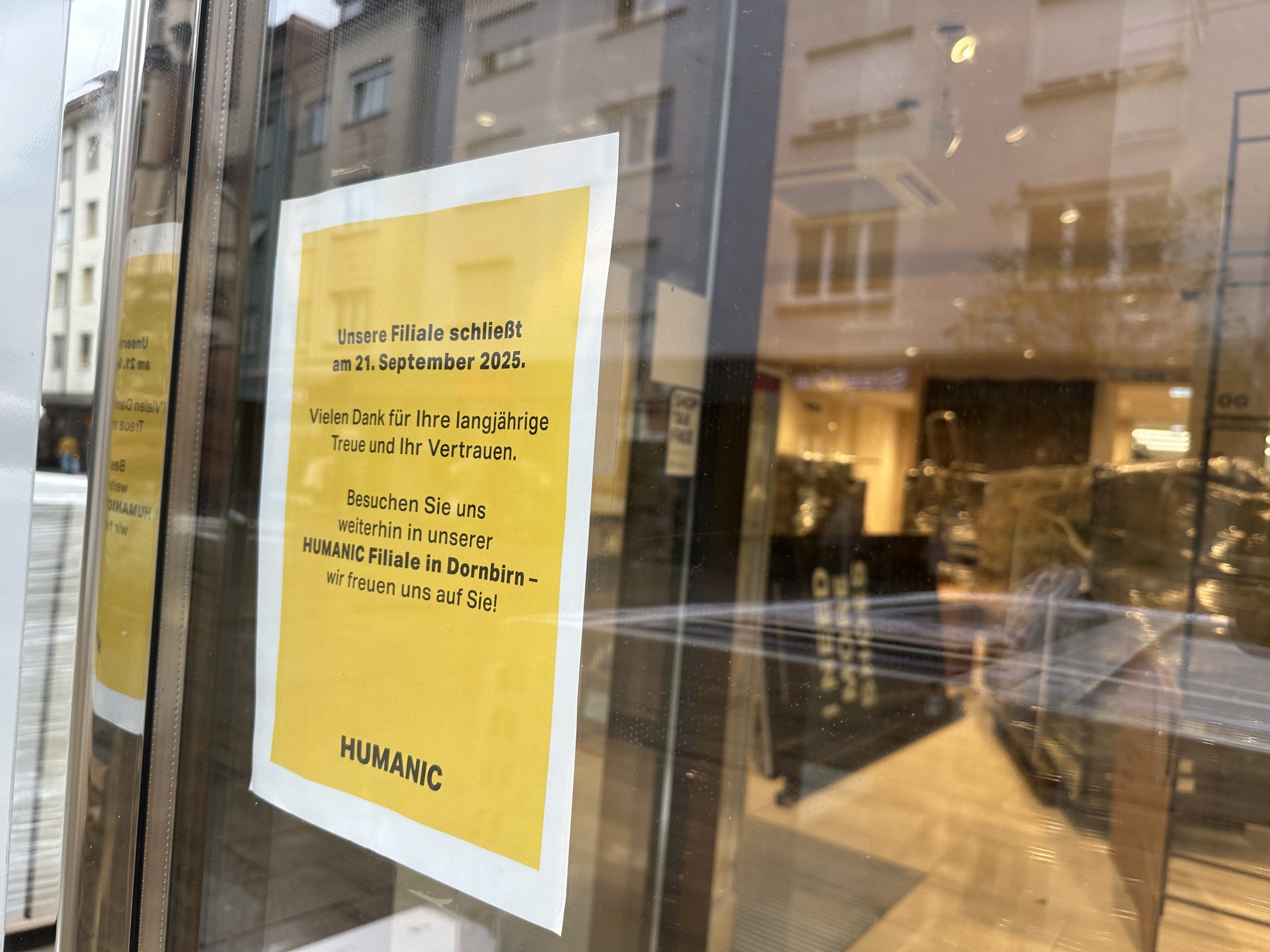 Im Schaufenster informiert ein gelber Aushang über die Schließung am 21. September. "Vielen Dank für Ihre langjährige Treue und Ihr Vertrauen", so die Belegschaft. "Besuchen Sie uns weiterhin in unserer Humanic-Filiale in Dornbirn."