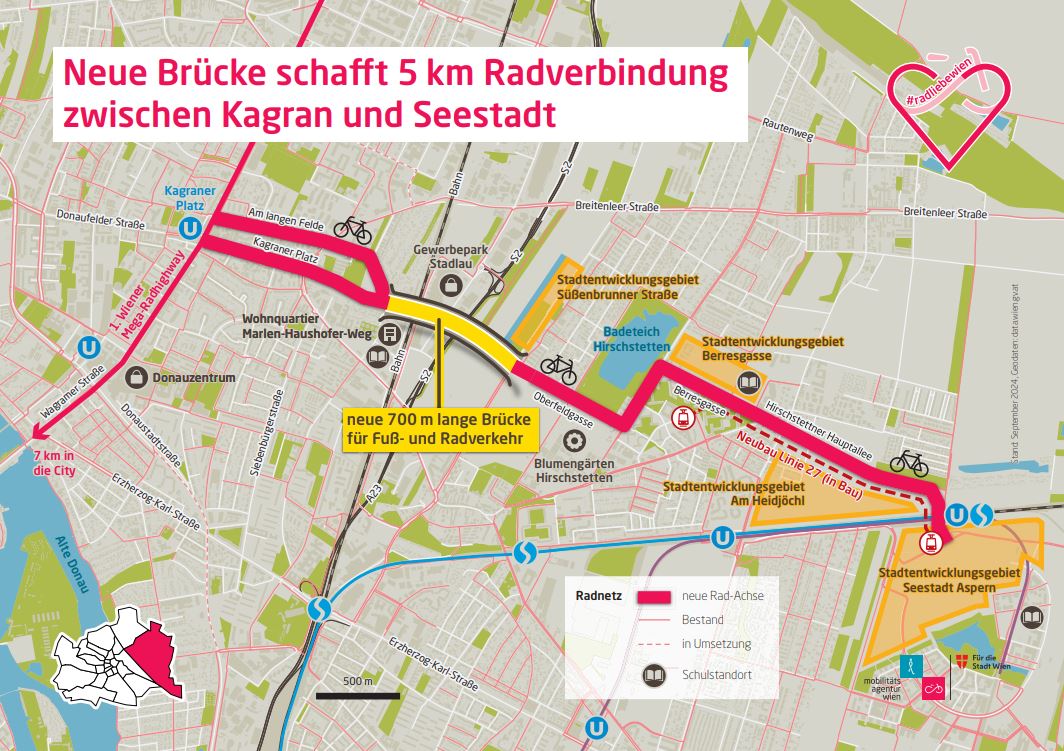 Die neue Verbindung ist auf einer Länge von 700 Metern neben der bestehenden Brücke der Straßenbahnlinie 26 geplant. Die Brücke wird einen durchgängig 4,5 Meter breiten Fuß- und Radweg aufweisen. Dadurch entsteht eine neue direkte Querverbindung für Radfahrer und Fußgänger durch die Donaustadt – vom Kagraner Platz bis zur Seestadt. Eine langjährige Forderung der Bürger im Bezirk, betonte auch Bezirksvorsteher Ernst Nevrivy (SPÖ).