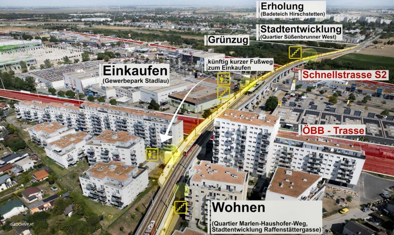 Konkret führt die Brücke von der Pogrelzstraße bis zur Süßenbrunner Straße. Unmittelbar profitieren sollen vor allem die Anwohner in den Wohngebieten westlich der ÖBB-Trasse, wie dem Quartier Marlene-Haushofer-Weg. Sie können künftig direkt und sicher zum Einkaufen in den Gewerberpark Stadlau oder zu nahe gelegenen Erholungsgebieten wie dem Badeteich Hirschstetten gelangen. Die Brücke ermöglicht darüber hinaus langfristig die Anbindung an die östlich der S2 gelegenen Stadtentwicklungsgebiete Süßenbrunnerstraße, Berresgasse und Heidjöchl mitsamt neuer Radinfrastruktur.