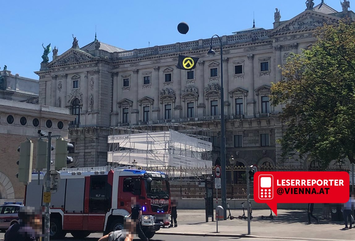 Ein Sprecher der Wiener Polizei hat berichtet, dass die Feuerwehr mehrere Fahnen beseitigt hat. Wie aus Fotos von Leserreporter Rajko F. hervorgeht, war die Feuerwehr am heutigen Donnerstag, 17. Juni unweit der Wiener Hofburg zu sehen. Schauplatz war demnach der Bereich vor dem Äußeren Burgtor. Auf den Bildern zu erkennen: Fahnen mit dem Zeichen der Identitären Bewegung.