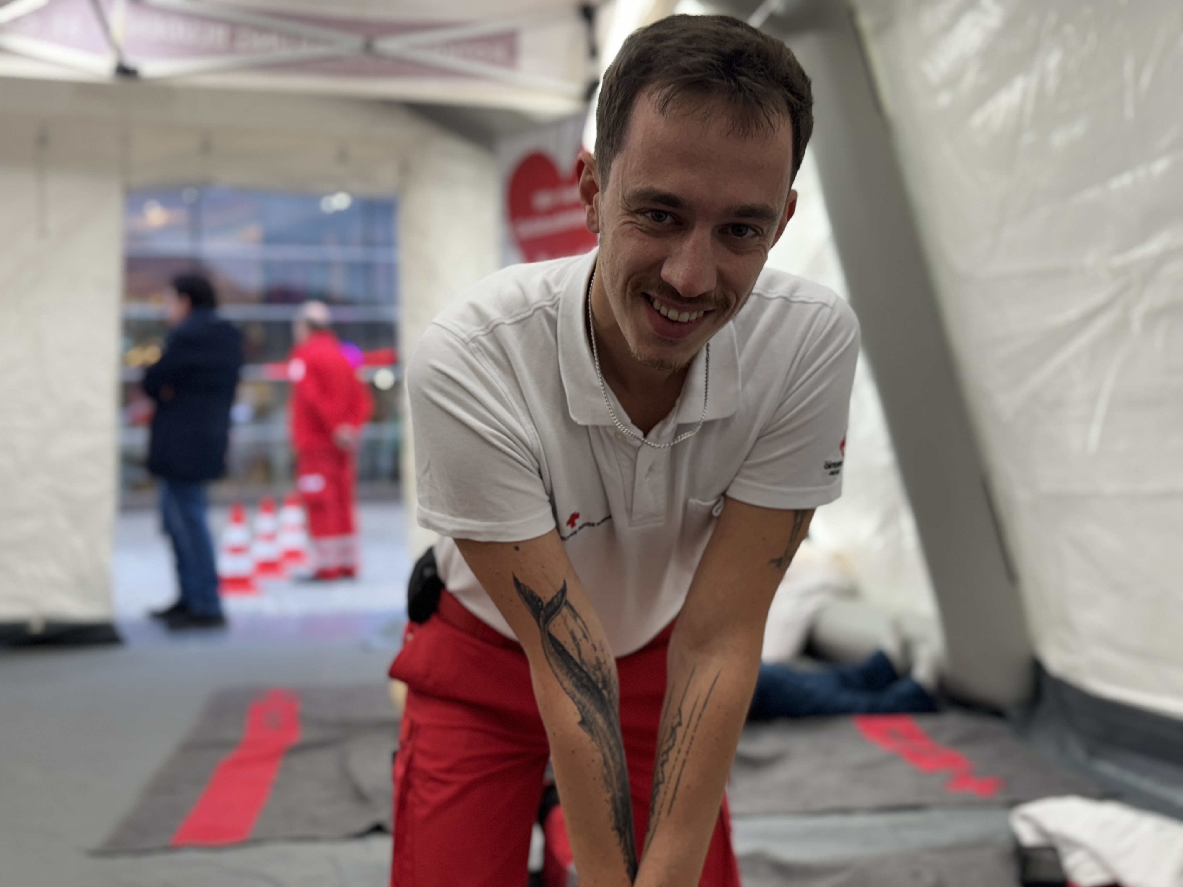 Besonders ist: Auch Passanten dürfen spontan mitmachen. Einer von ihnen ist Kilian Arndt, der sich kurzerhand beteiligt hat. "Ich finde es cool, dass man hier gleich eine kleine Auffrischung bekommt", sagt er. "Mein letzter Erste-Hilfe-Kurs ist schon ein paar Jahre her, da ist es gut, das mal wieder zu üben." Arndt drückte rund eineinhalb Minuten im Takt, bevor der nächste Teilnehmer übernahm.