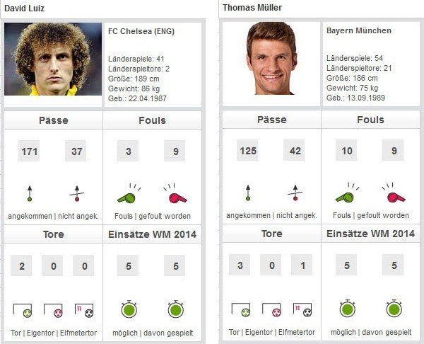 Bei den Deutschen ist Thomas Müller der amtierende Torschützenjäger. Die Brasilianer müssen auf ihren Top-Scorer Neymar wegen eines Wirbelbruchs verzichten. Die zweitmeisten Tore schoss Luiz.