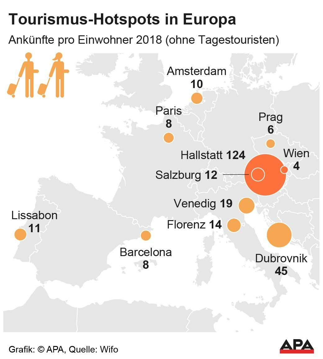 Der Übertourismus macht jedenfalls auch vor Österreich nicht Halt: In Hallstatt etwa kamen 2018 auf einen Einheimischen gut 124 Urlauber - Tagestouristen sind in dieser Zahl noch nicht enthalten. Damit war dort die Belastung pro Einwohner fast dreimal so stark wie in Dubrovnik (45,4) oder mehr als sechsmal so stark wie in Venedig (19,3), wie aus einer Aufstellung zur Tourismusintensität in europäischen Städten des Wifo hervorgeht. Das Problem potenziert sich in Hallstatt noch dadurch, dass viele Besucher nur einen kurzen Zwischenstopp für ein paar Fotos einlegen, also nicht einmal Geld für ein Mittagessen im Ort lassen.