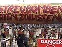 Flugblätter mit der Aufschrift: Wäre dieses Flugblatt eine Streubombe, wären Sie jetzt tot werden verteilt und eine meterhohe Schuhpyramide vor dem Burgtheater aufgebaut. Fußprothesen hängen an Zeltwänden und Bilder von Streubombenopfern zieren den Veranstaltungsplatz.