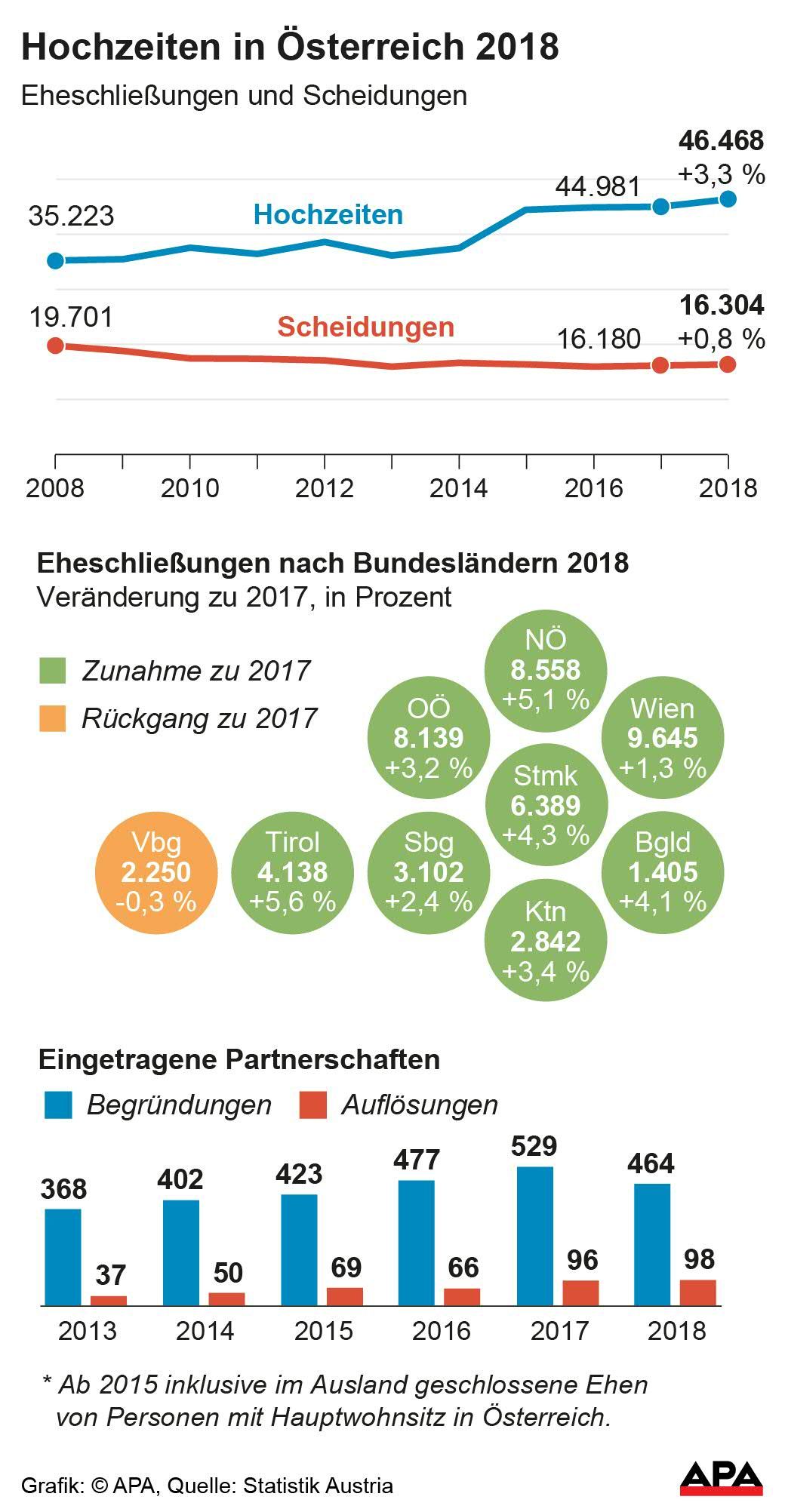 Insgesamt 16.304 Ehen wurden 2018 rechtskräftig geschieden, um 0,8 Prozent mehr als im Jahr davor. Zugleich wurden 98 eingetragene Partnerschaften aufgelöst, zwei mehr als 2017 (plus 2,1 Prozent). Die Gesamtscheidungsrate war 2018 mit 41 Prozent gleich hoch wie 2017.