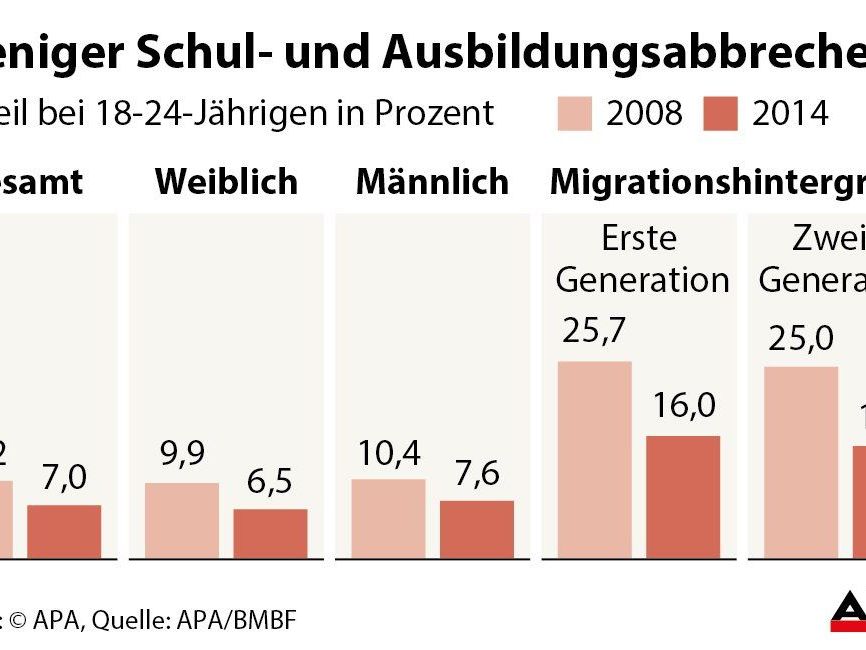 Die Zahl der Schul- bzw. Ausbildungsabbrecher ist in Österreich in den vergangenen Jahren zurückgegangen. Sie schwankte in den Jahren zwischen 2004 und 2008 noch um die zehn Prozent – 2014 waren es nur mehr sieben Prozent. Migranten brechen dabei deutlich häufiger ab, zeigt die Beantwortung einer parlamentarischen Anfrage durch Bildungsministerin Gabriele Heinisch-Hosek (SPÖ).