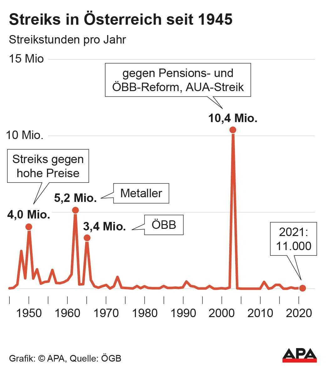Im Jahr 2021 gab es laut ÖGB insgesamt etwas weniger Streikstunden als in den Jahren davor. Die Zahl der Streikstunden lag demnach im Vorjahr bei 11.368 mit rund 5.000 teilnehmenden Beschäftigten. 2020 gab es mehr Arbeitsniederlegungen: Die Zahl der Streikstunden lag bei rund 29.500, jene der Beschäftigten bei 9.883.
