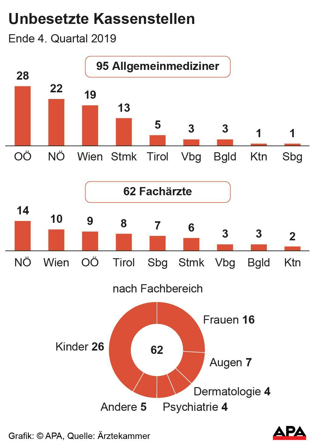 Am größten ist das Problem in Oberösterreich wo 28 Kassenstellen für Allgemeinmediziner und neun für Fachärzte unbesetzt sind. In Niederösterreich sind es 22 für Allgemeinmediziner und 14 für Fachärzte, in Wien 19 für Allgemeinmediziner und zehn für Fachärzte.