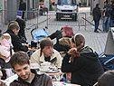 Als Zaungäste im wahrsten Sinne des Wortes. Bis dahin hatten aber immerhin die Vorbereitungen für eifriges Treiben gesorgt. Hier wurden Kabel verlegt, da noch der eine oder andere Scheinwerfer installiert. Café- Tische und -Stühle wurden nach dem Tagesbetrieb versorgt, um dem toughen Mister Bond und seinem Auto für die Szene Platz zu machen.