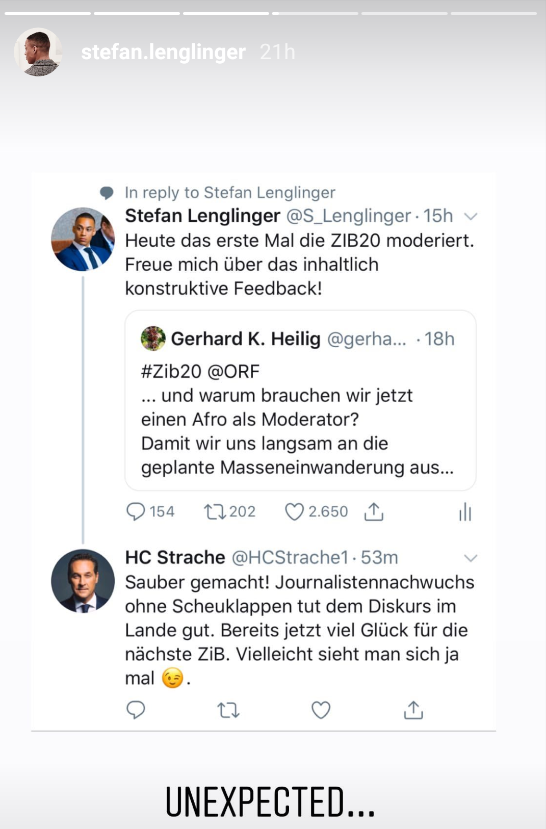 In seiner Instagram-Story teilte Lenglinger die Beiträge von Klenk und Wolf. Letzterem dankte er dafür. Einen weiteren lobenden Kommentar hatte er aber anscheinend nicht erwartet. Heinz-Christian Strache gratulierte dem neuen Moderator und meinte, dass sie sich ja vielleicht mal sehen werden. Lenglinger schrieb nüchtern dazu: "unerwartet..."