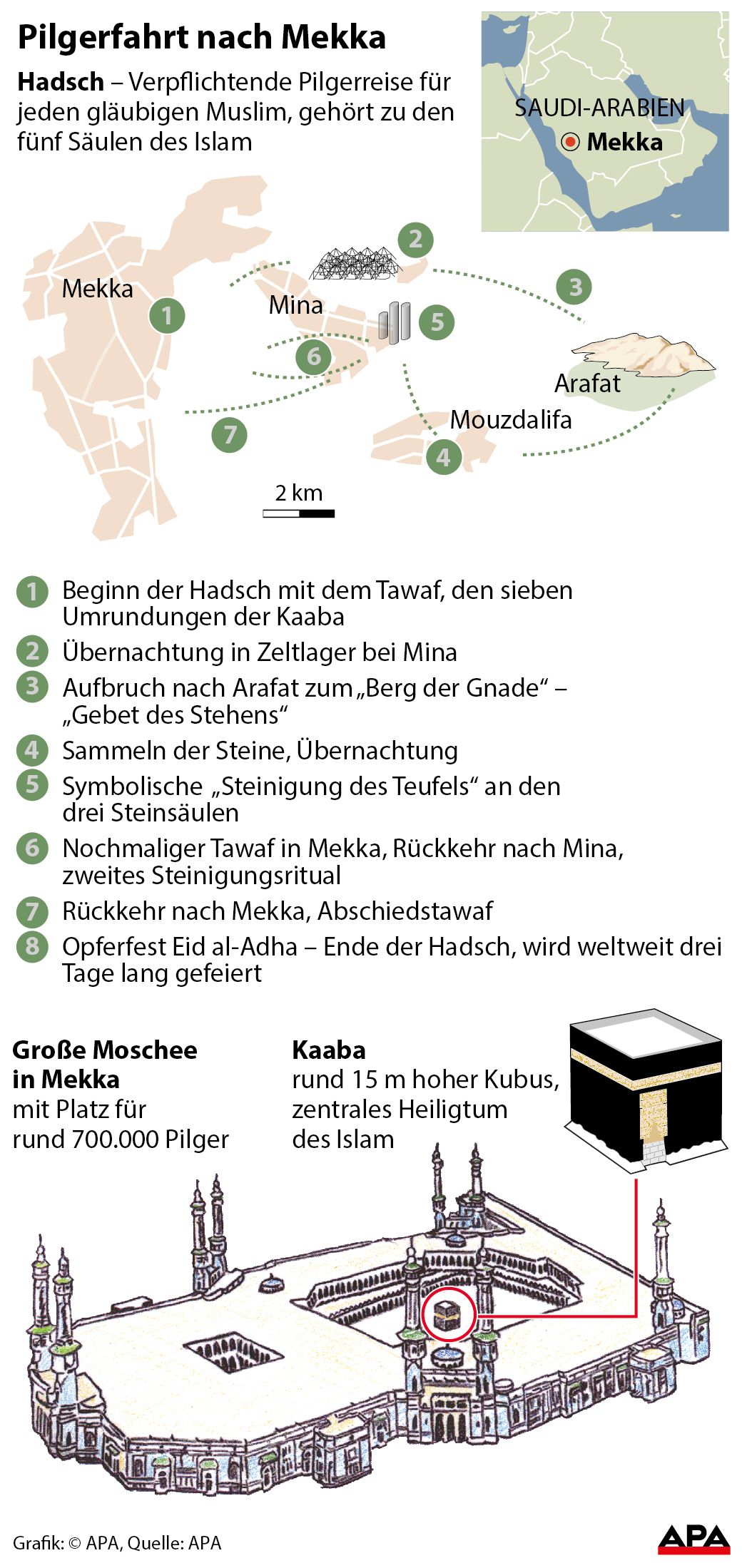 Vor zwei Jahren waren bei einer Massenpanik während der Wallfahrt nach offiziellen Angaben 769 Pilger ums Leben gekommen. Inoffizielle Berechnungen gehen von rund 2.000 Todesopfern aus. Die Behörden ließen danach die Sicherheitsstrukturen überarbeiten. Überschattet wird die Wallfahrt in diesem Jahr von der diplomatischen Krise zwischen Katar und seinen Nachbarstaaten am Golf.