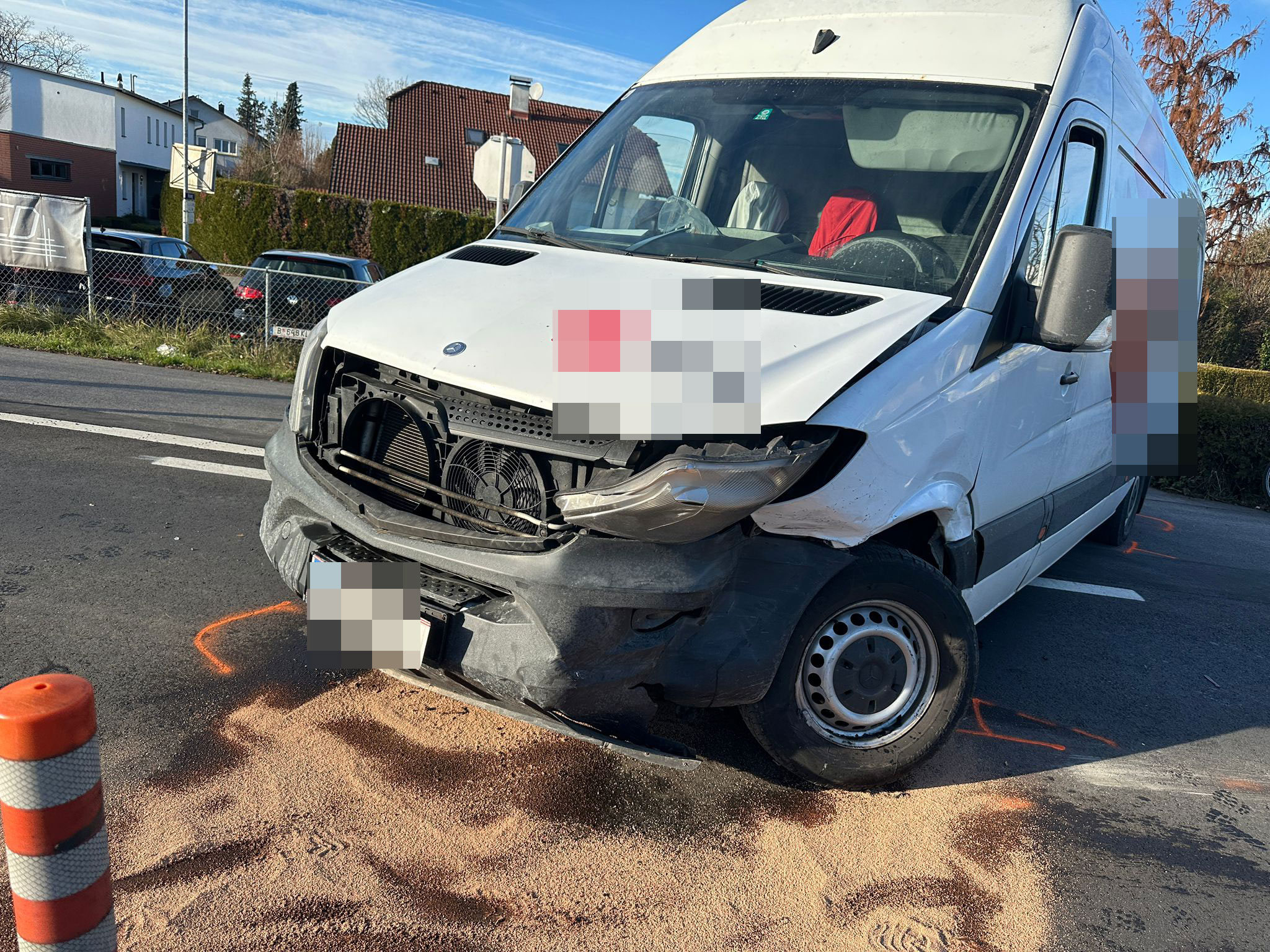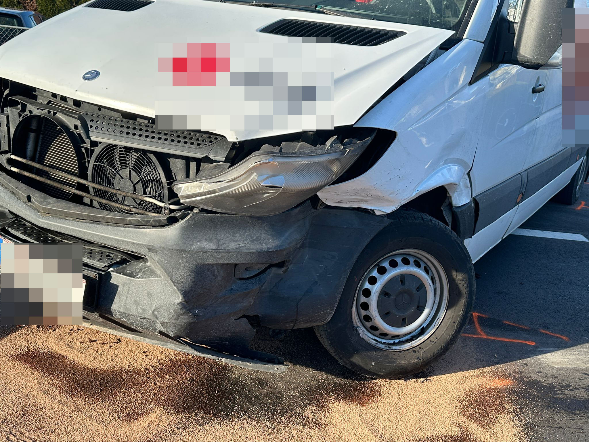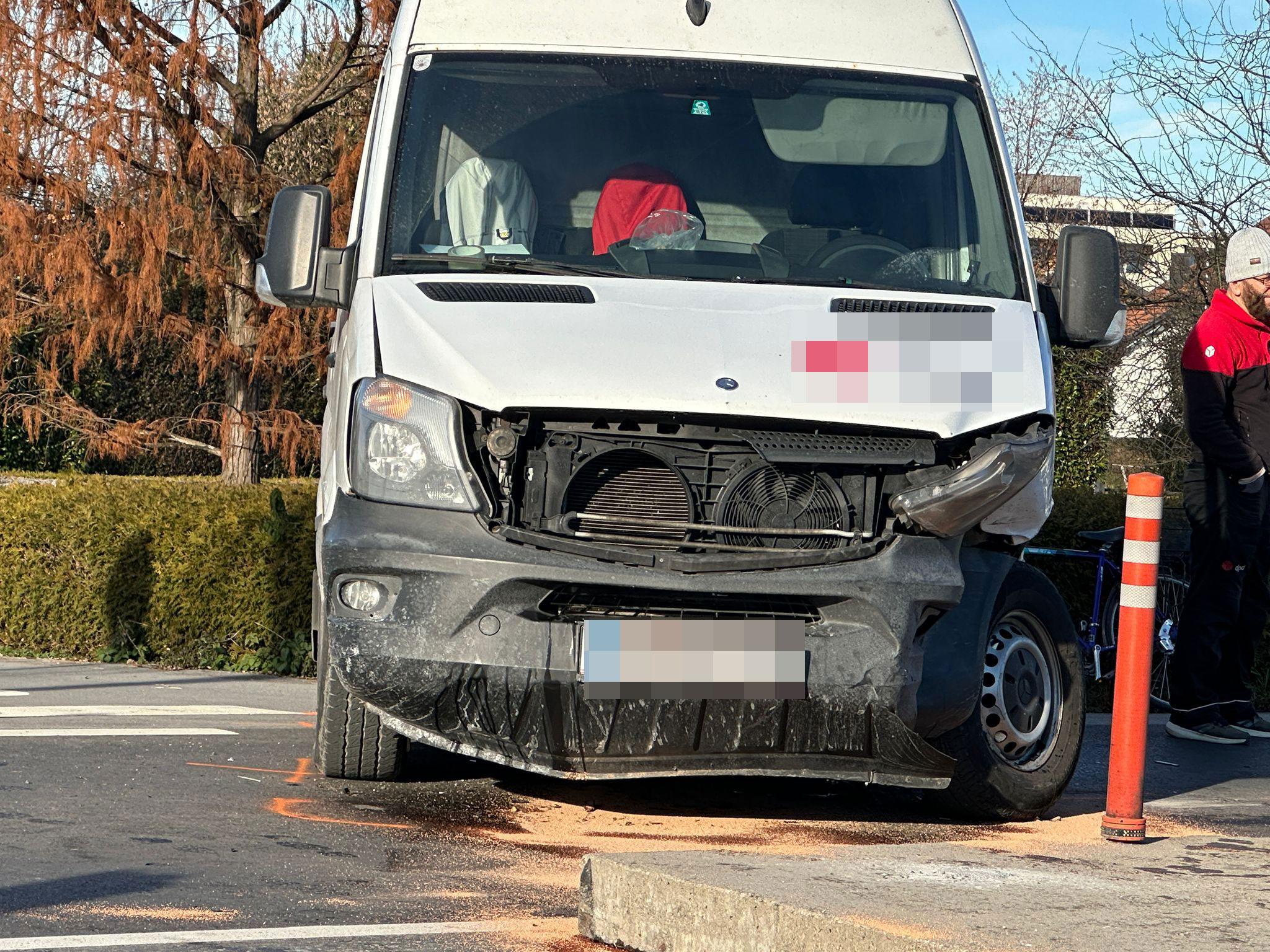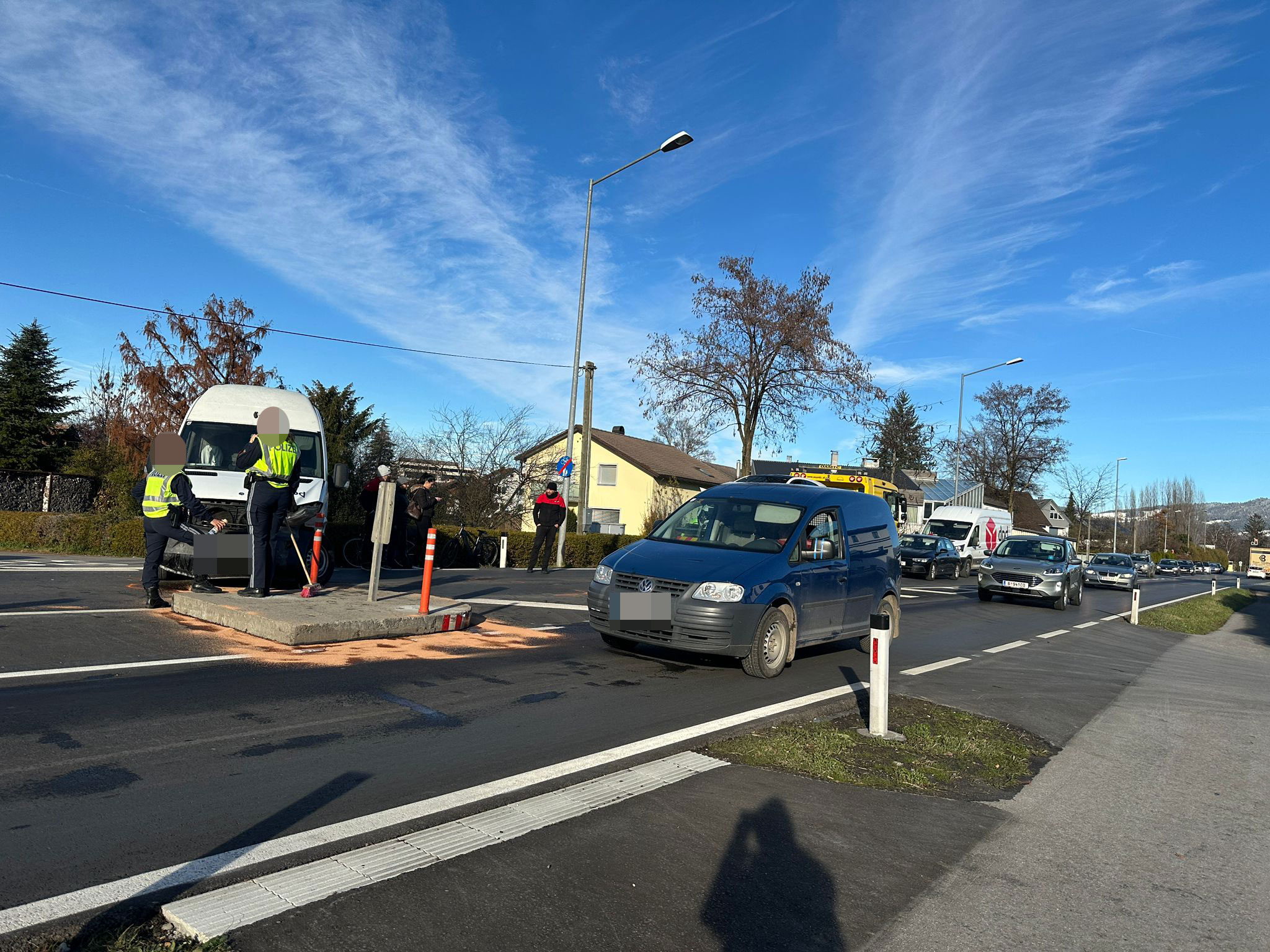 Der Lieferwagen kam nach der Kollision im Bereich einer Verkehrsinsel zum Stillstand; Markierungen zeigen den Einschlagpunkt.
