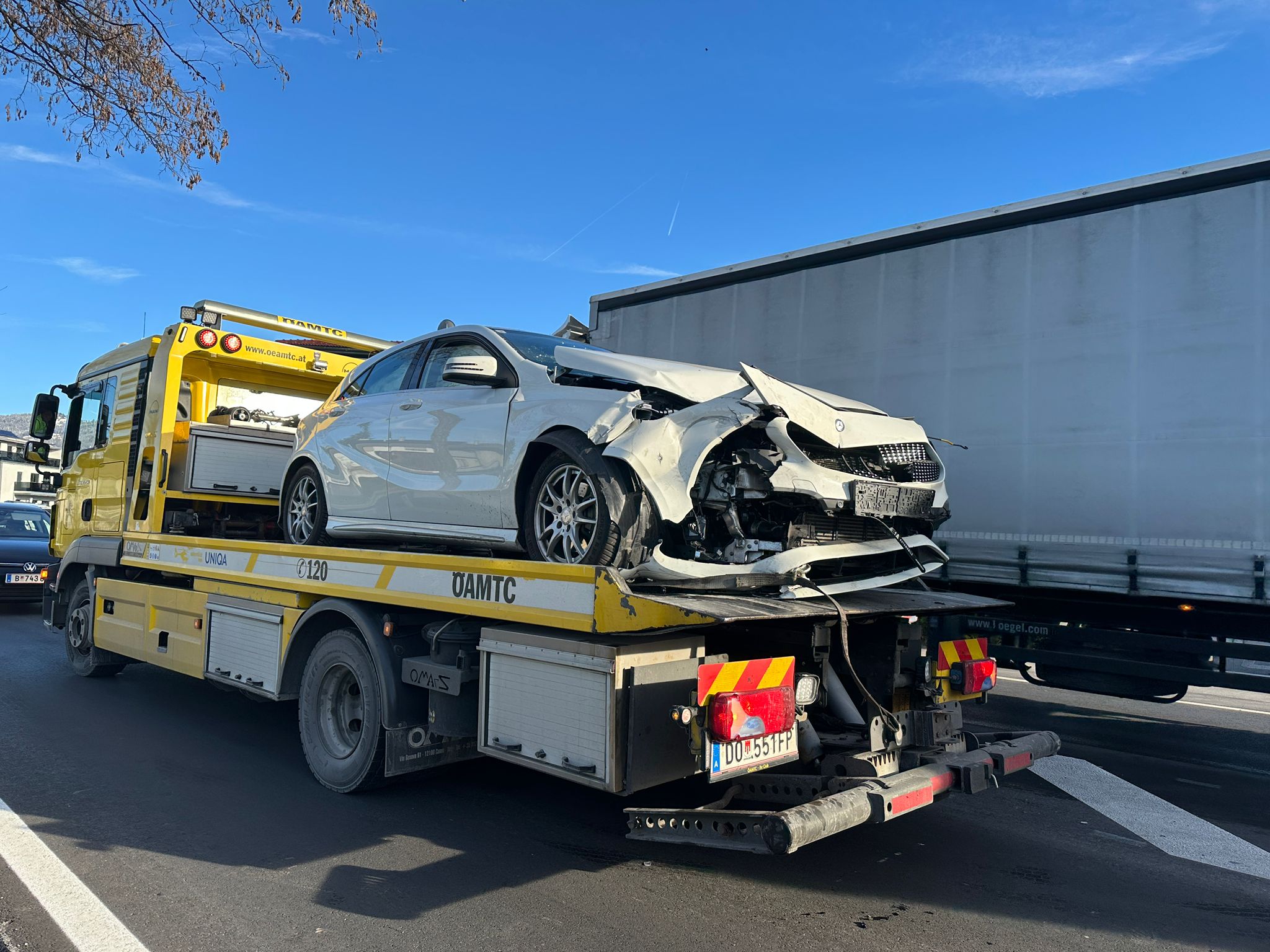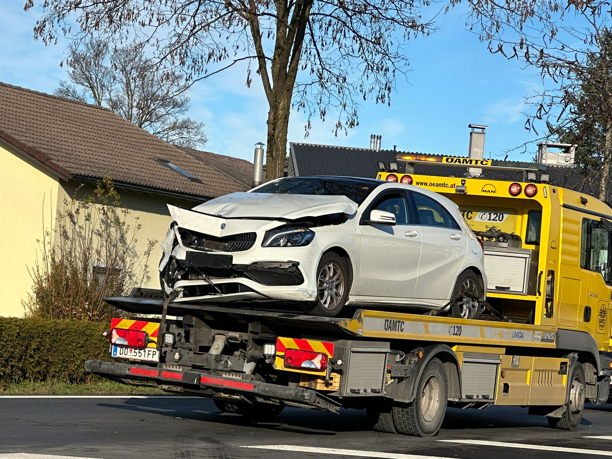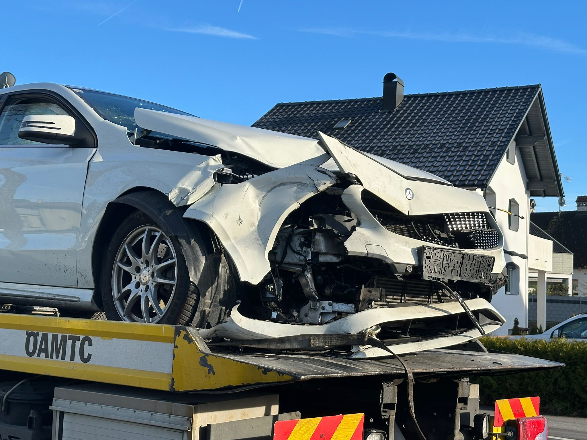 Ein stark beschädigter Pkw wird nach dem Zusammenstoß auf der L202 in Hard von einem ÖAMTC-Abschleppfahrzeug geborgen.