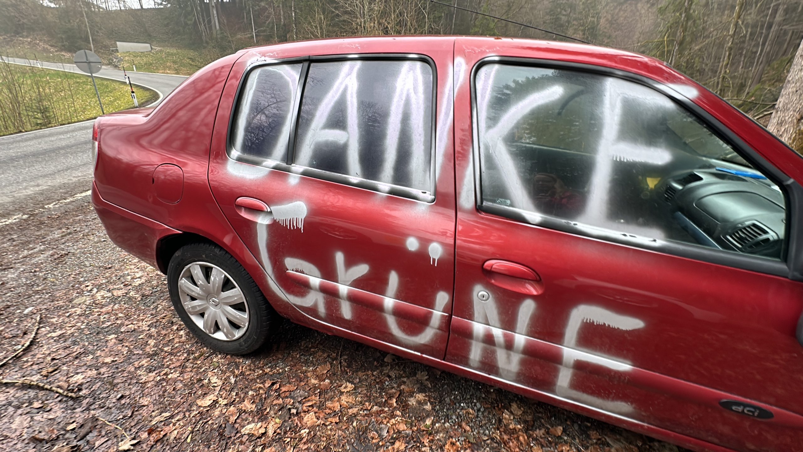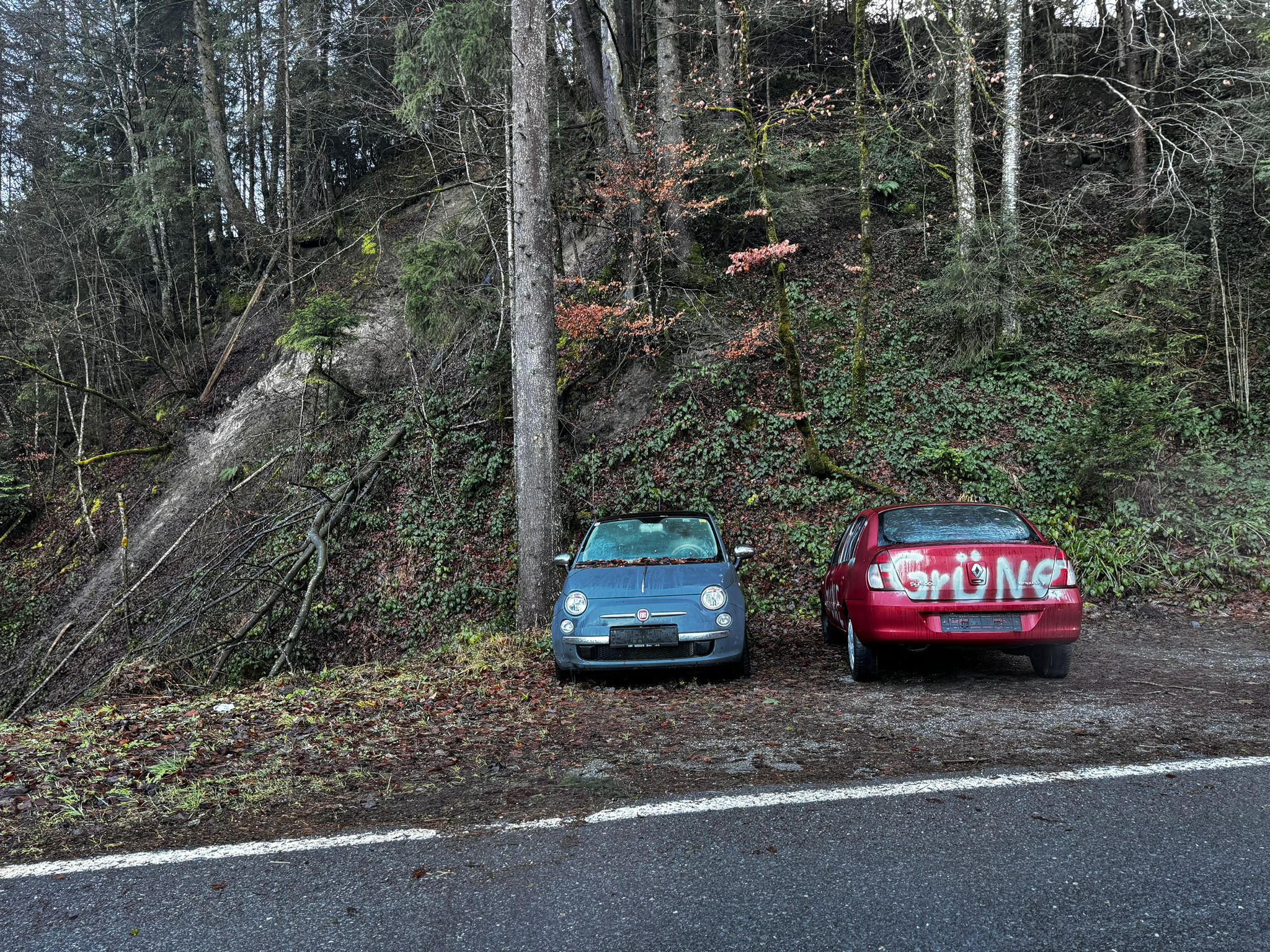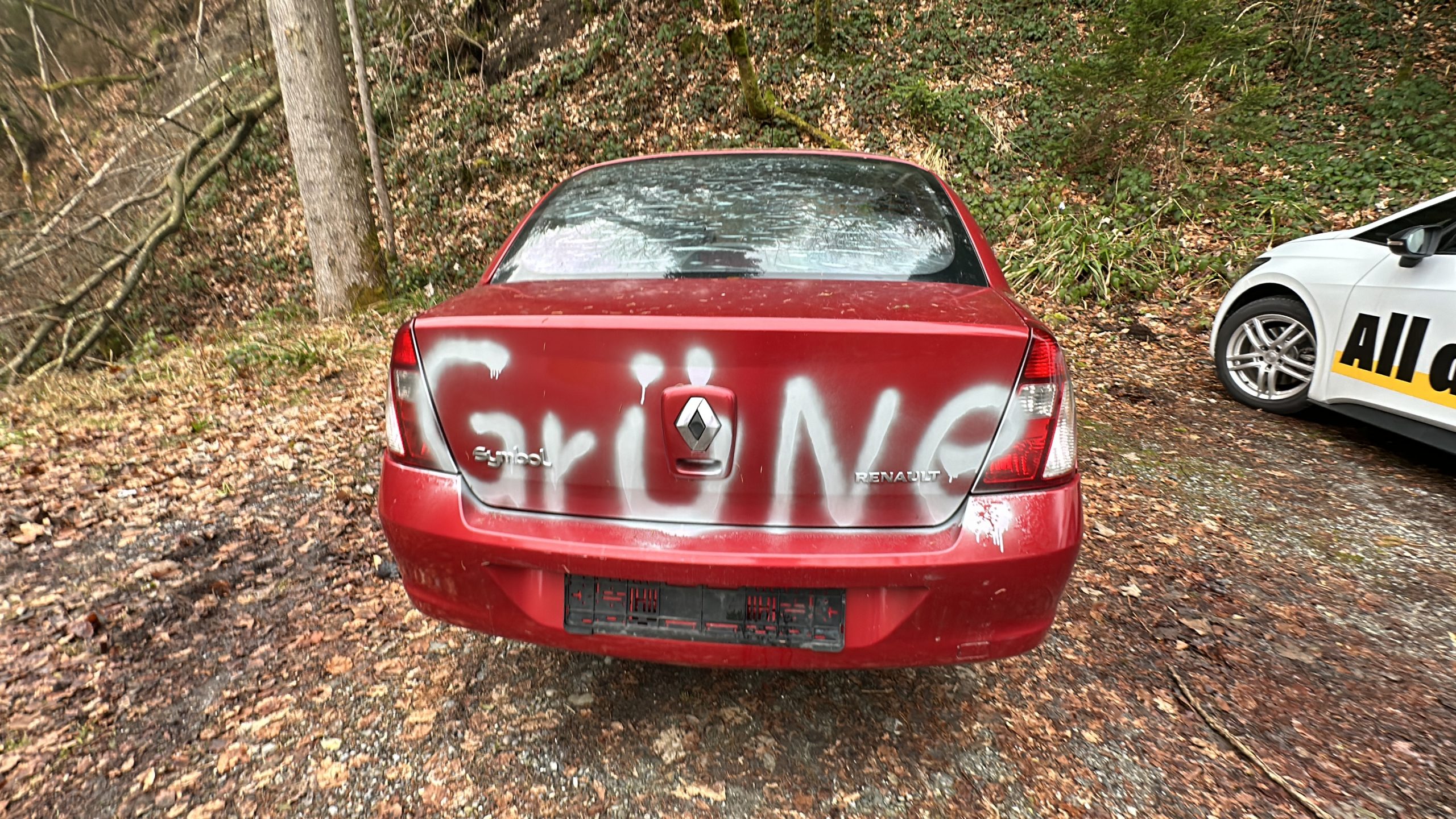 Zwei verwahrloste, kennzeichenlose Schrottautos sorgten an der Bregenzerwaldstraße in Dornbirn für Wirbel. Der grau-blaue Fiat wurde bereits vor rund zwei Wochen entfernt, während der rote Renault weiterhin stehenblieb. Das Auto war mit "Danke Grüne" besprüht und wies mehrerer Schäden auf.